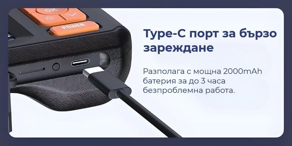 8. Зареждане: С USB Type-C кабел (5V/1A). Зареждане ≈ 2.5 ч. / работа ≈ 3 ч.