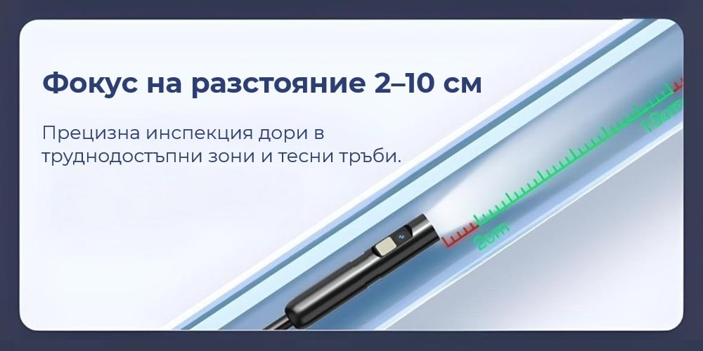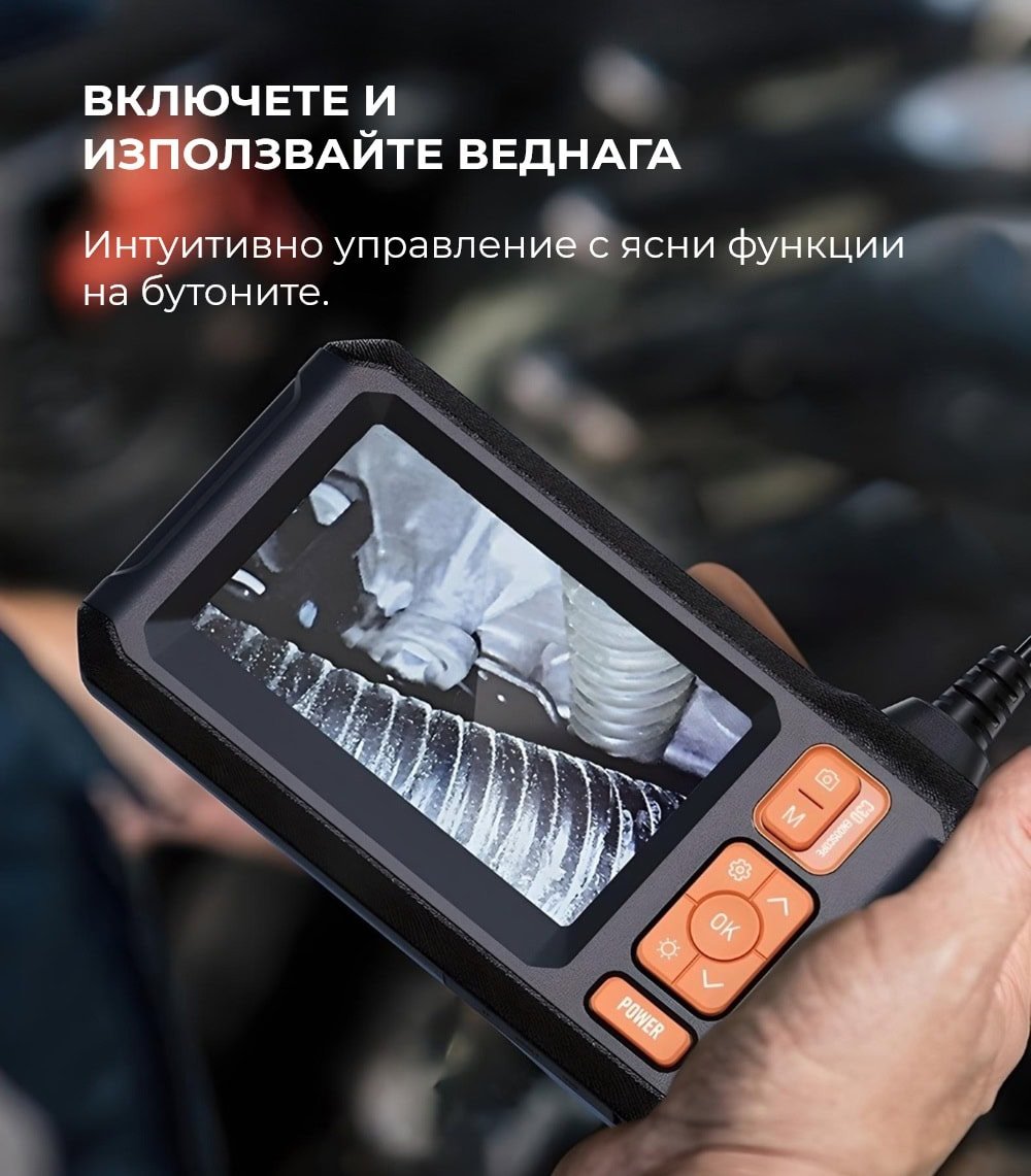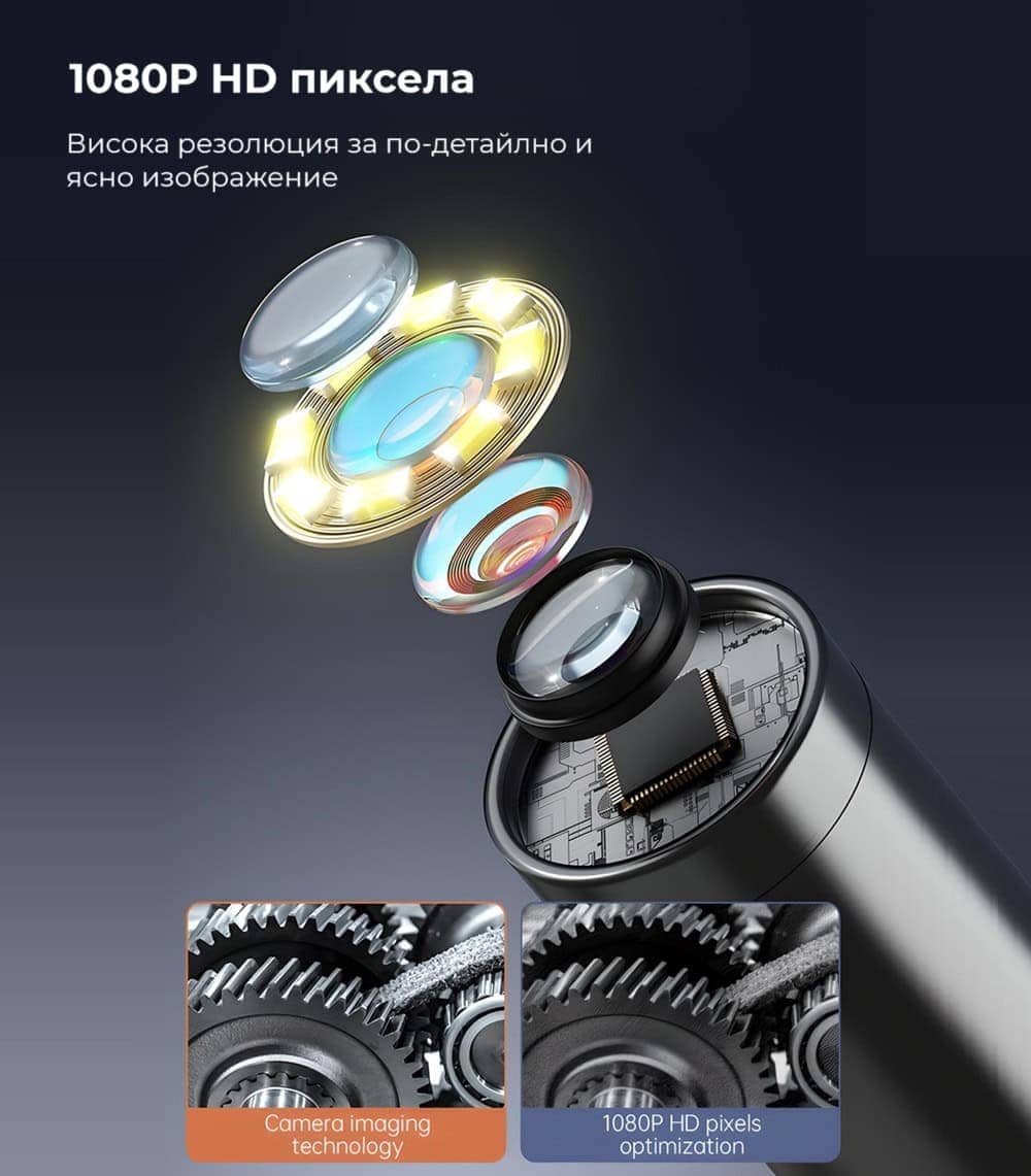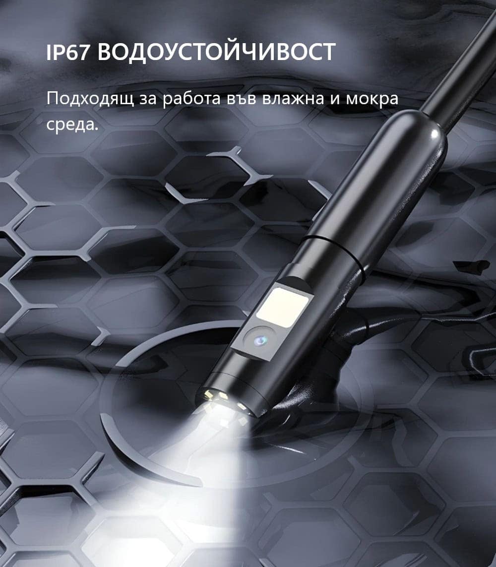 Благодарение на вградените 2MP CMOS сензори и 1080P Full HD резолюция, устройството улавя ясни изображения и видео с висока детайлност. IP67 водоустойчивост, 9 регулируеми LED светлини и полу-твърд кабел  правят този модел идеален за инспекция на тръби, машини, автомобили и труднодостъпни места.