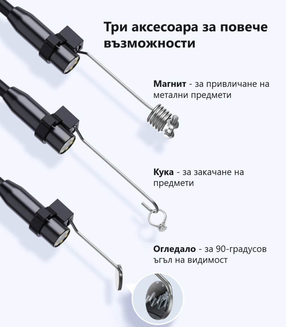 Комплектът включва кука, магнит и странично огледалце за допълнително разширяване на възможностите при огледи и намиране на предмети в тесни пространства.