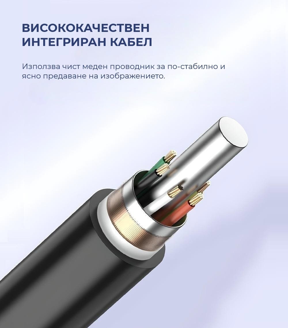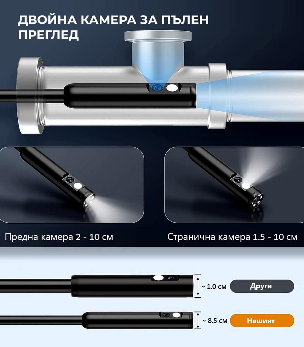 Ендоскопът разполага с фронтална и странична 2MP HD камера, които осигуряват лесно превключване между два ъгъла на наблюдение само с един бутон. Това позволява изключително детайлна инспекция без нужда от огледални приставки.