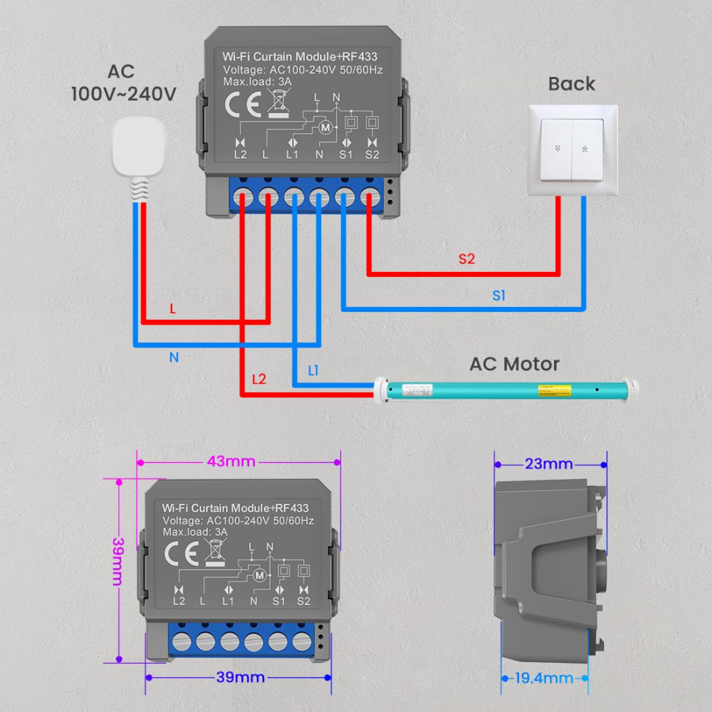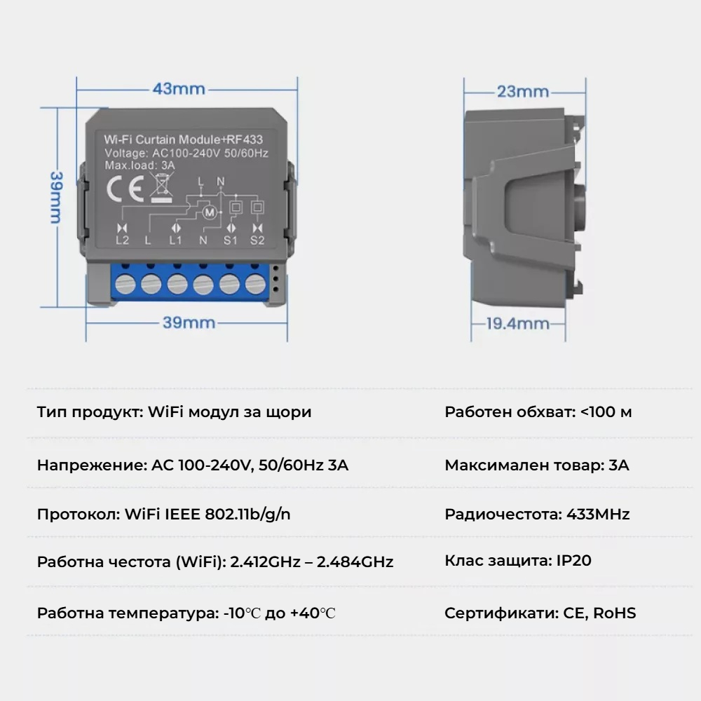 AVATTO CSM16 предлага два независими начина за управление на щорите – чрез WiFi и чрез RF 433 MHz дистанционно. Това ви осигурява пълен контрол както през мобилно приложение от всяка точка на света, така и локално чрез дистанционно управление – дори когато нямате достъп до интернет. Комбинацията от двете технологии прави устройството гъвкаво и надеждно във всякакви ситуации.