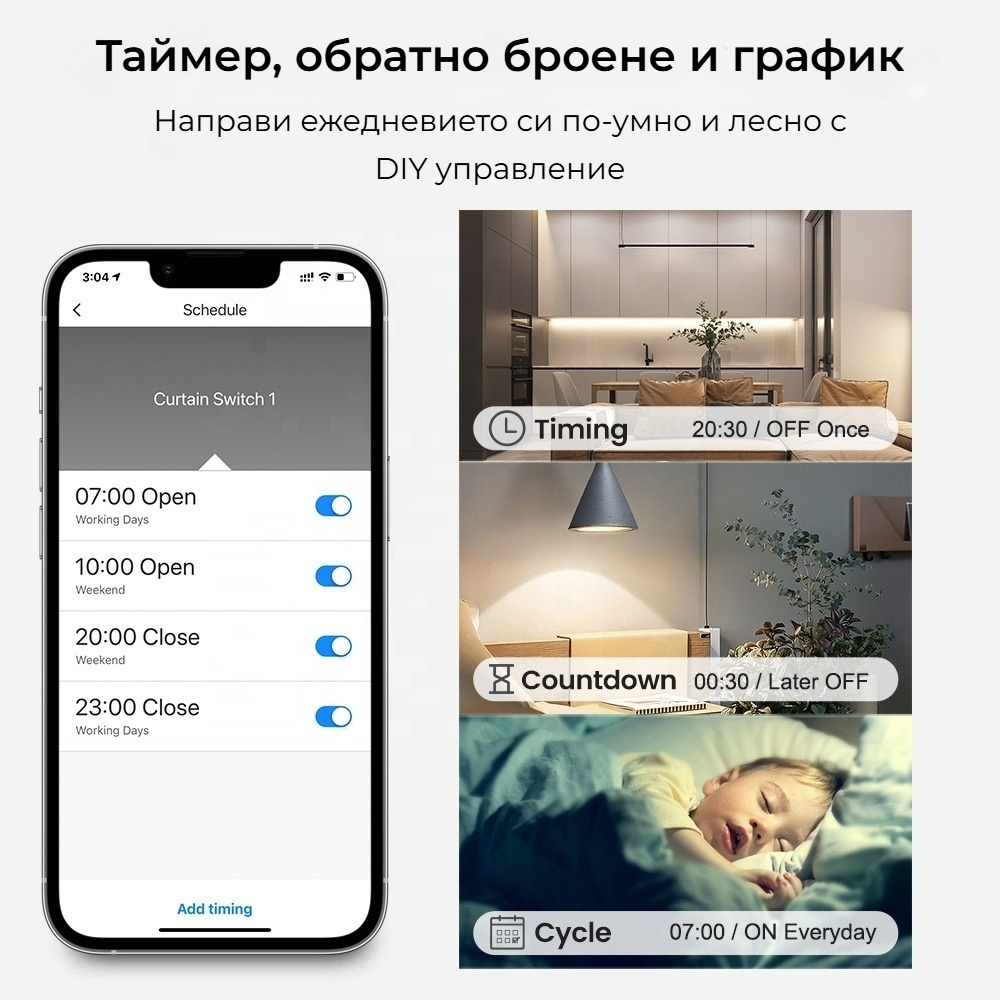 Обратното броене позволява да настроите времеви интервал след активиране, след който щорите автоматично ще се отворят или затворят – идеално за ситуации, когато искате да ограничите времето за осветление или да контролирате щорите без допълнително внимание.