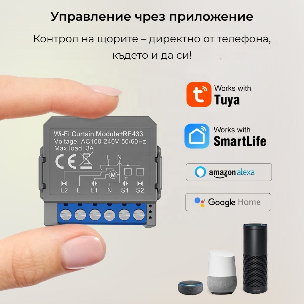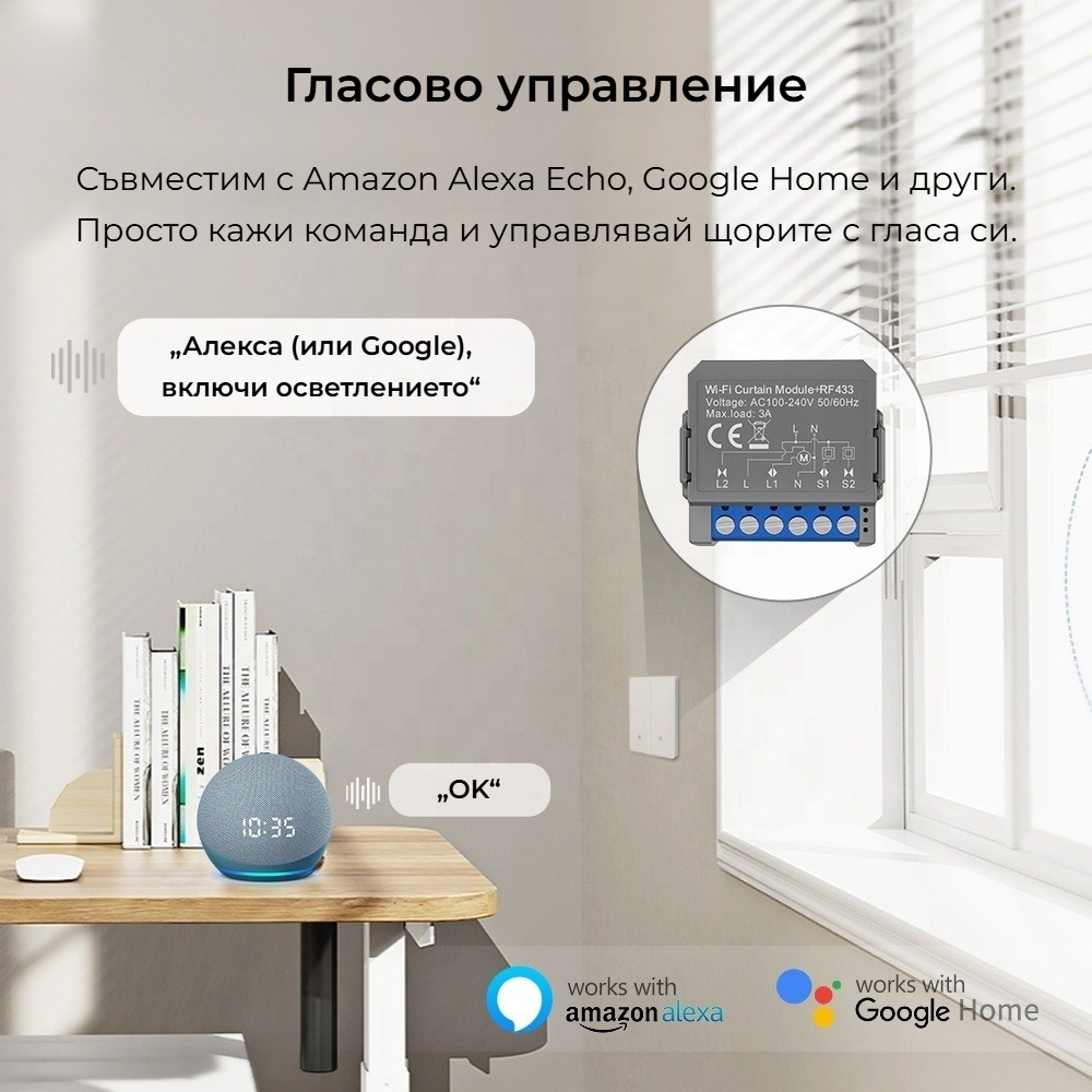 Модулът е съвместим с популярни гласови асистенти като Amazon Alexa и Google Assistant, което ви дава възможност да управлявате щорите само с гласова команда. Освен това може да се свърже със смартфон чрез мобилно приложение (Smart Life или Tuya Smart), което осигурява пълен контрол от всяка точка на света.