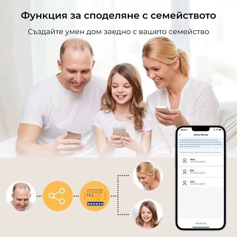 Avatto DMS16 ви дава възможност да споделите управлението на осветлението с други членове на семейството чрез мобилното приложение. Това означава, че повече от един потребител може да управлява устройството – включително включване/изключване, димиране, създаване на графици и други настройки.