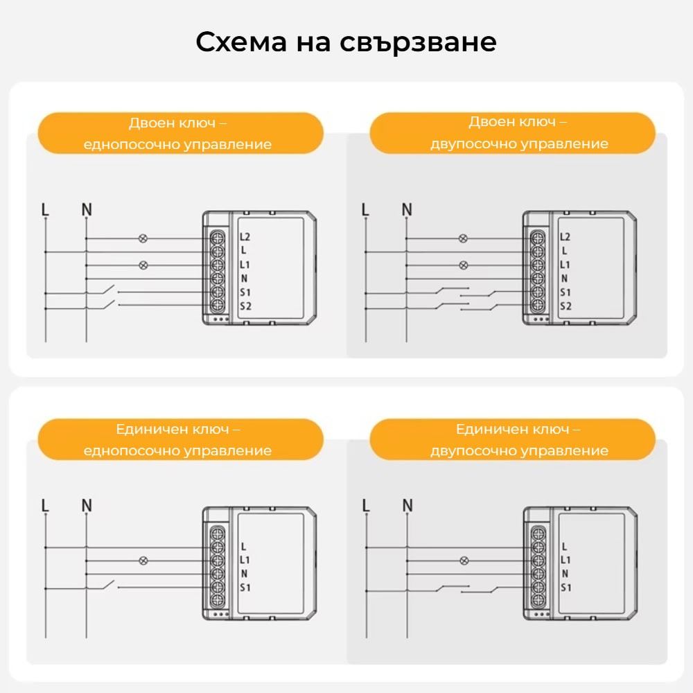 Тези опции позволяват гъвкавост при интегриране на модула в съществуващи електрически инсталации и улесняват работата с различни типове осветление и ключове.