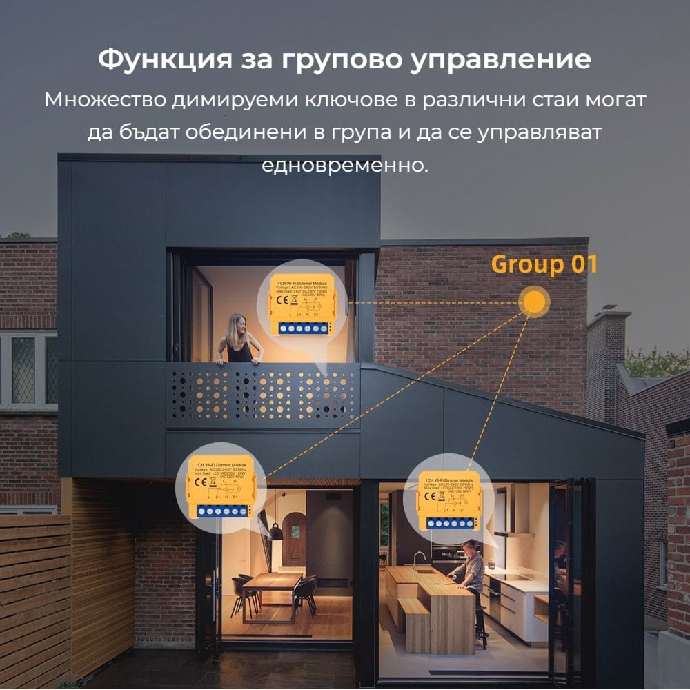 Функцията е изключително удобна при отворени пространства, големи помещения или когато желаете да синхронизирате осветлението на няколко места, без да ги настройвате поотделно.