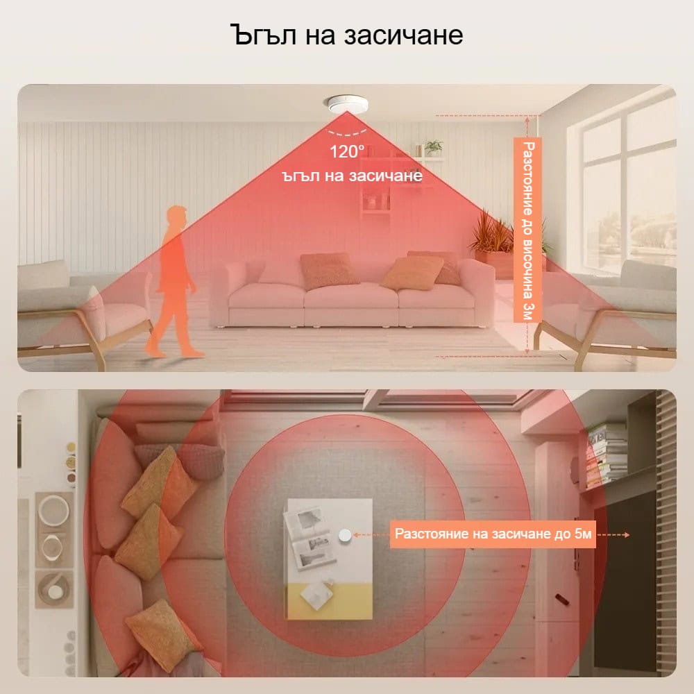 Avatto HE20 покрива голяма площ благодарение на 120° ъгъл на засичане отгоре и 360° страничен обхват. Сензорът улавя движение и присъствие на разстояние до 5 метра, което го прави идеален за дневни, спални, коридори и офиси. Независимо къде е поставен – на стена, таван или бюро – гарантира надеждно откриване в реално време.
