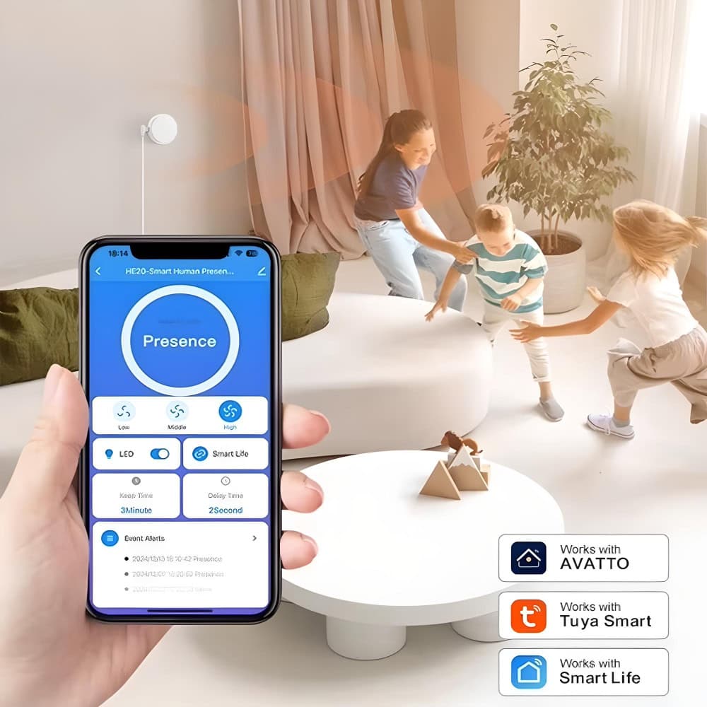 Avatto HE20 е интелигентен сензор за присъствие, който използва 24GHz милиметрова радарна технология, за да засича както движение, така и присъствие на неподвижни хора. Устройството работи чрез WiFi и се управлява дистанционно чрез мобилно приложение. Благодарение на компактния си дизайн, сензорът се вписва дискретно във всяко помещение и е подходящ за използване в дома, офиса или търговски обекти. Осигурява висока точност, бърза реакция и възможност за автоматично управление на осветление, завеси и други смарт устройства.