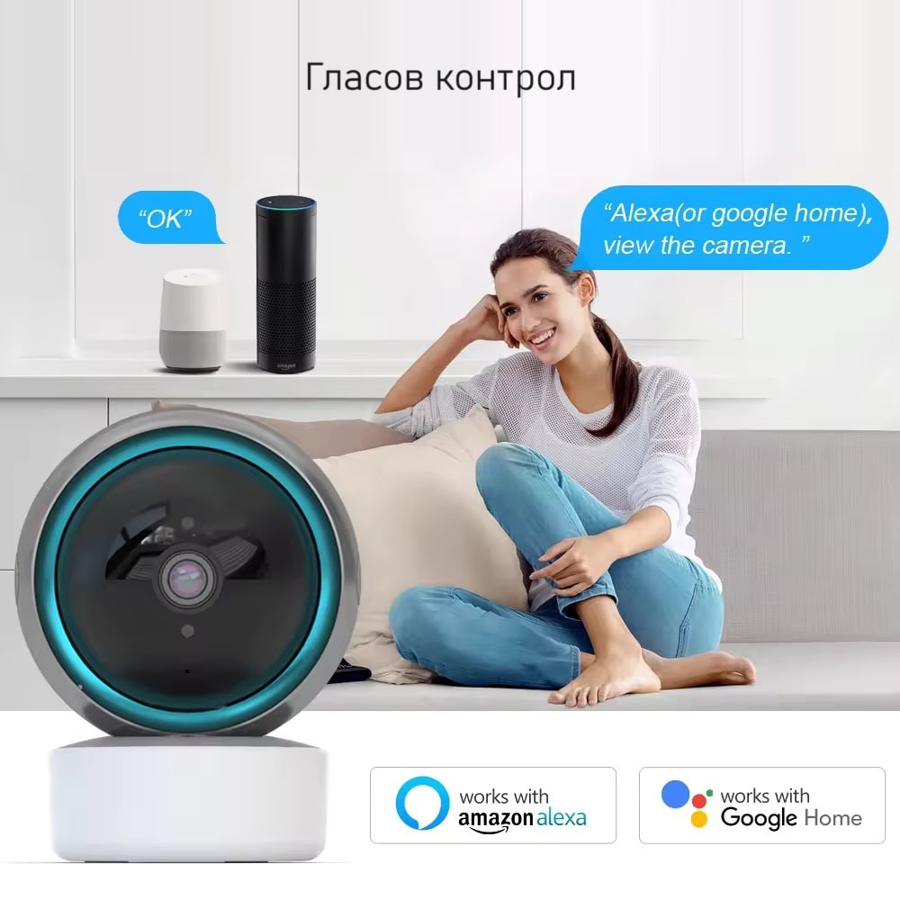 Камерата е съвместима с Amazon Alexa и Google Assistant, позволявайки ви да я контролирате с гласови команди и да я интегрирате в вашата смарт домашна система.