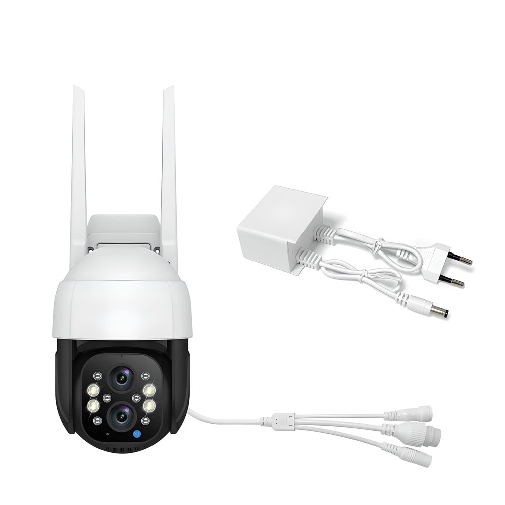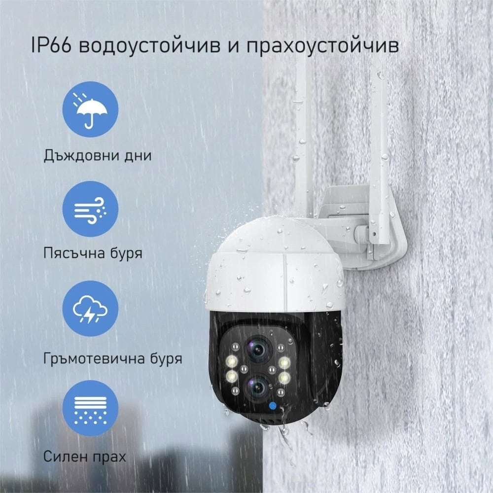 | Други функции | Двоен обектив (телефото и широкоъгълния обектив), дистанционно управление чрез приложение, гласово управление (съвместимост с Alexa, Google Home, Yandex Alice и други), двупосочни аудио обаждания, детекция на движение и следене, активиране на сирена в екстрени ситуации, възпроизвеждане и запис на видео, IP66 водоустойчив и противопрахов дизайн, светлинен контрол, функция за споделяне на достъп с членове на семейството, свързване с други смарт устройства |