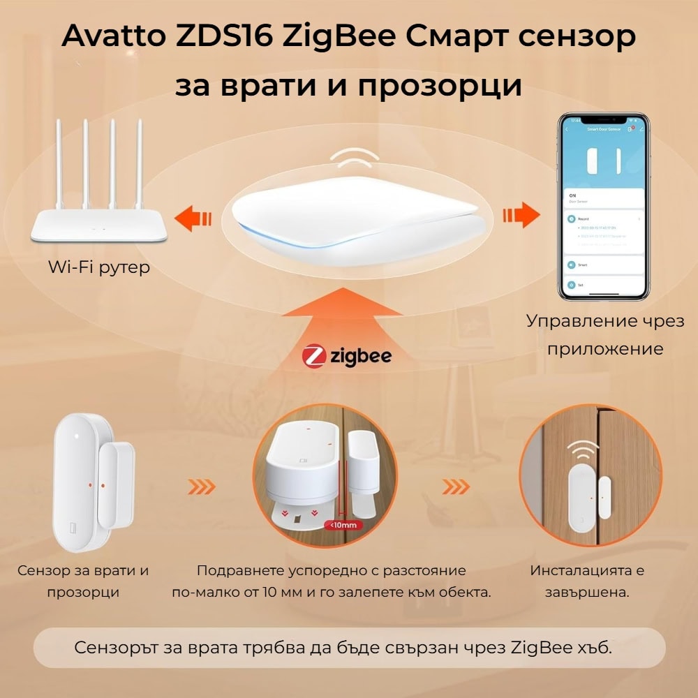 Avatto ZDS16 използва надеждния ZigBee протокол, който осигурява стабилна, бърза и енергийно ефективна комуникация между всички свързани умни устройства в дома ви. ZigBee е утвърден стандарт за интелигентна домашна автоматизация, гарантиращ висока сигурност и ниска консумация на енергия. За свързване на Avatto ZDS16 към вашата система е необходим AVATTO ZigBee хъб (gateway), който служи като централна точка за управление и координация на всички устройства.