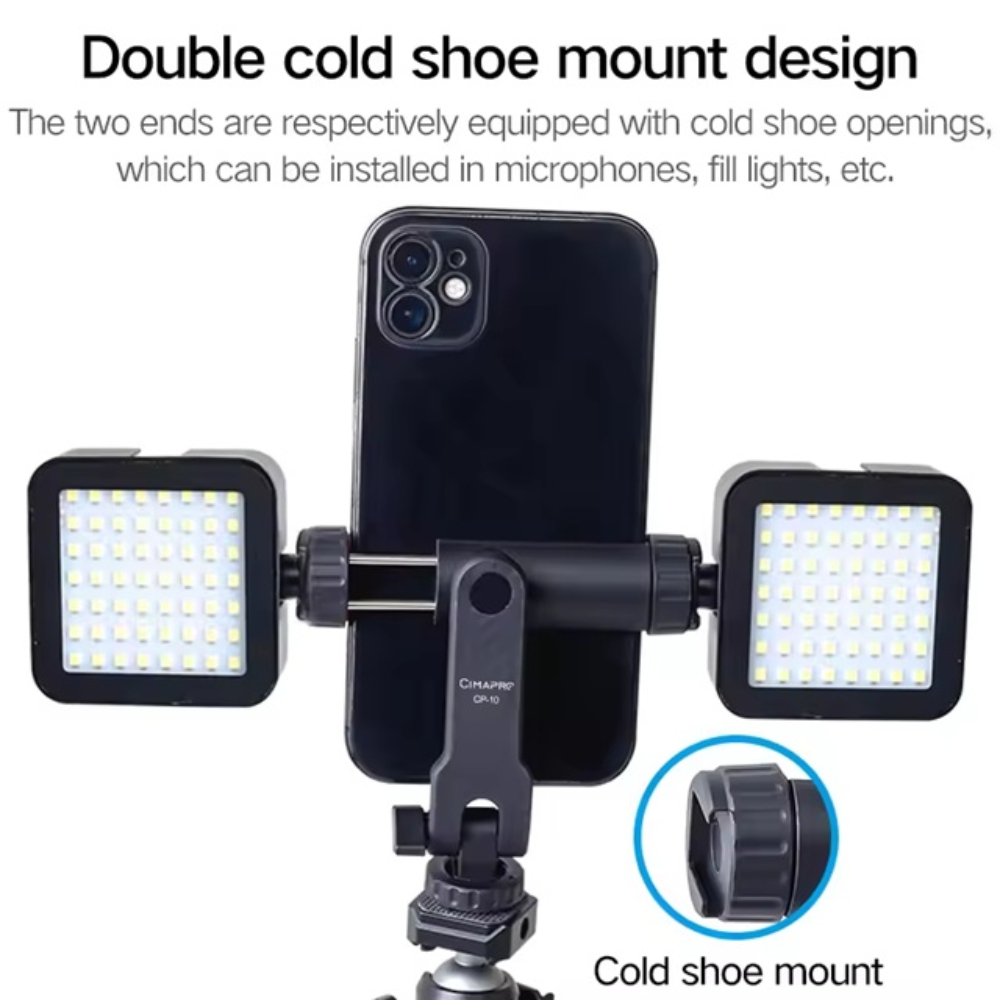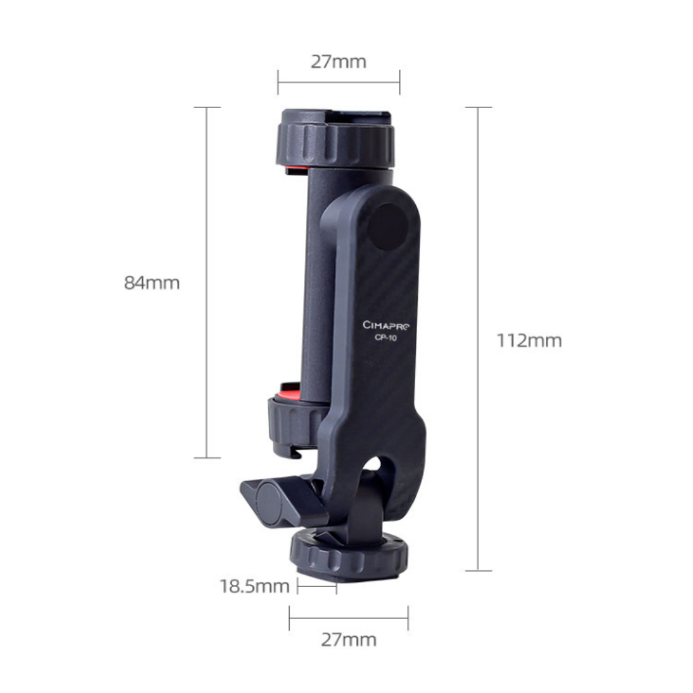 Cimapro CP-10 е универсално и изключително функционално решение за всеки, който снима видео със смартфон. Благодарение на двойните Cold Shoe конектори, 360° ротацията и стабилния регулируем захват (55–90 мм), държачът осигурява свобода, гъвкавост и надеждност при всяка снимачна ситуация.