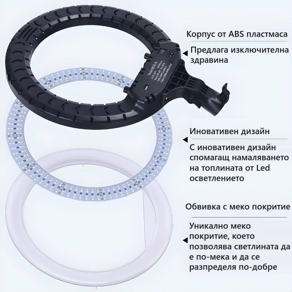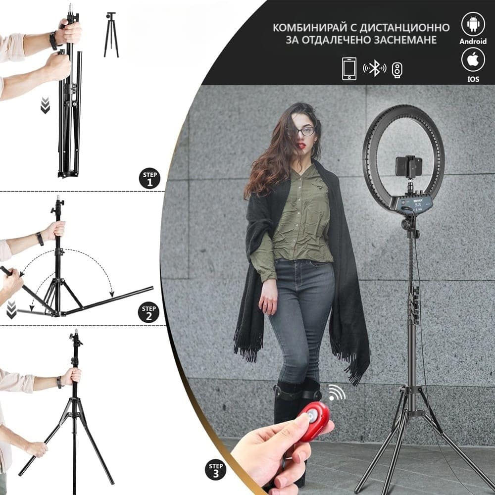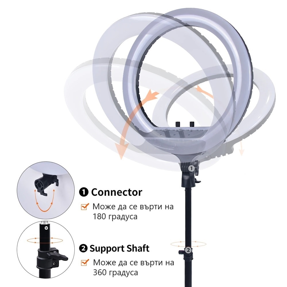 Със своите 480 LED лампички, този пръстен предоставя ярка и равномерна светлина, осигурявайки висококачествени снимки и видеа. Вградената възможност за димиране и три различни цветови режима позволяват персонализиране на осветлението с висока степен на контрол.