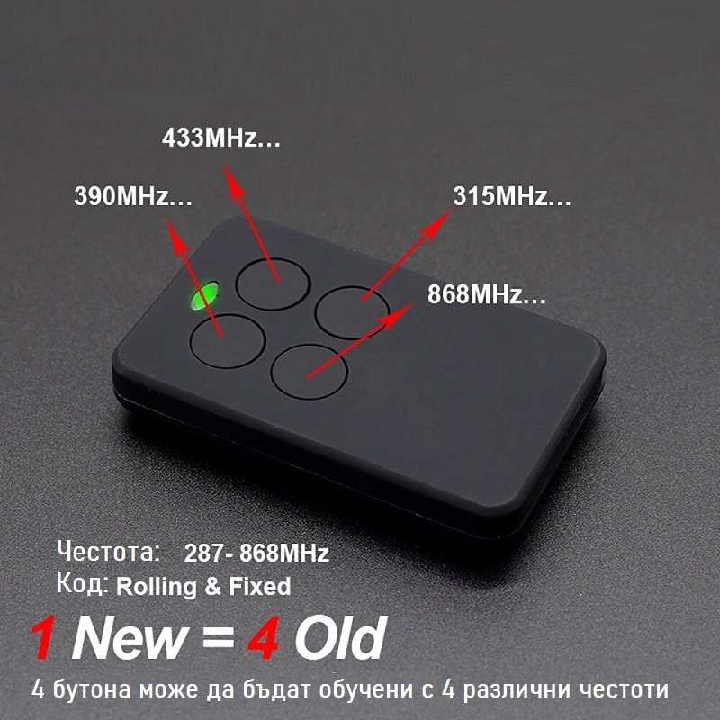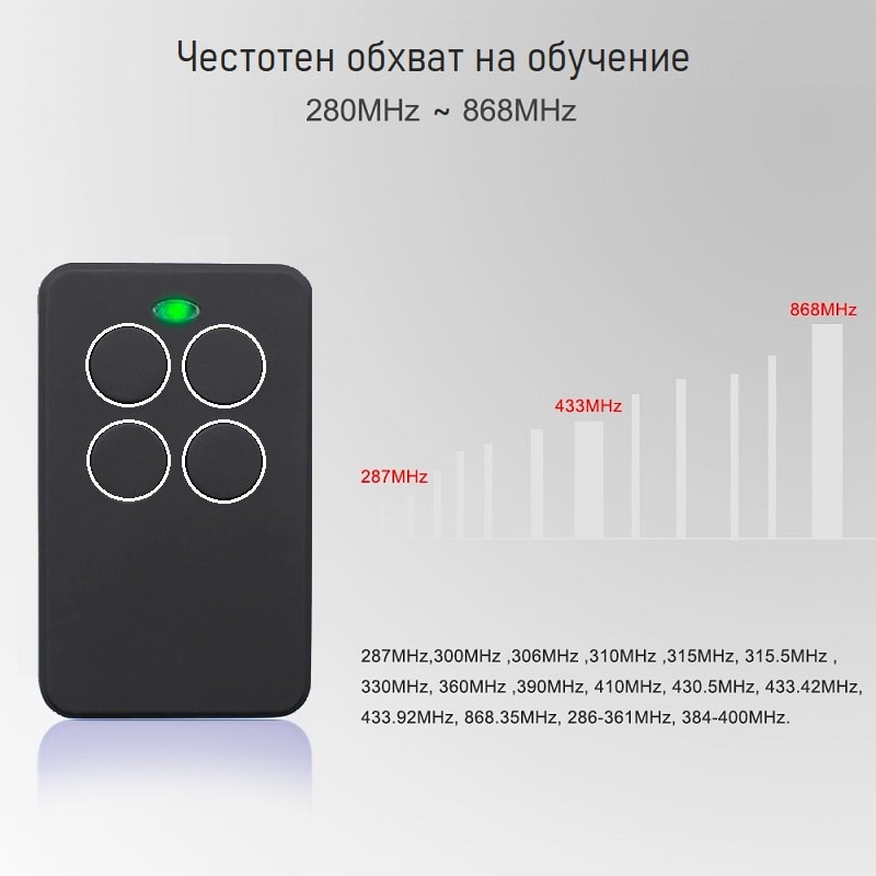 В случай, че имате RF дистанционно работещо на честота между 280~868MHz настроено за работа с входаната врата, гараж, бариера, лесно може да го дублирате и да предоставите: