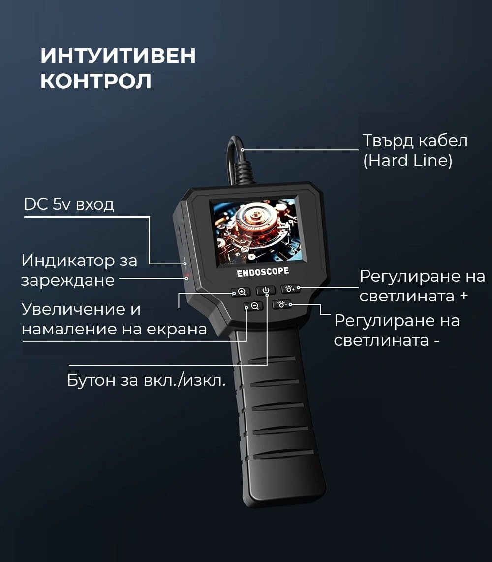 Предлага се в два варианта – с твърд кабел с дължина 5 или 10 метра, което го прави подходящ за работа в тесни пространства, тръби, уреди, машини и скрити зони без нужда от външни устройства или Wi-Fi връзка.