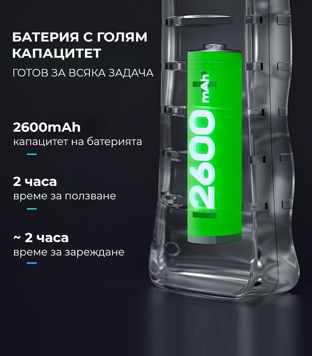 Вградената литиево-йонна батерия с капацитет 2600mAh осигурява до 2 часа непрекъсната работа и се зарежда само за около 2 часа чрез USB кабел (включен в комплекта).