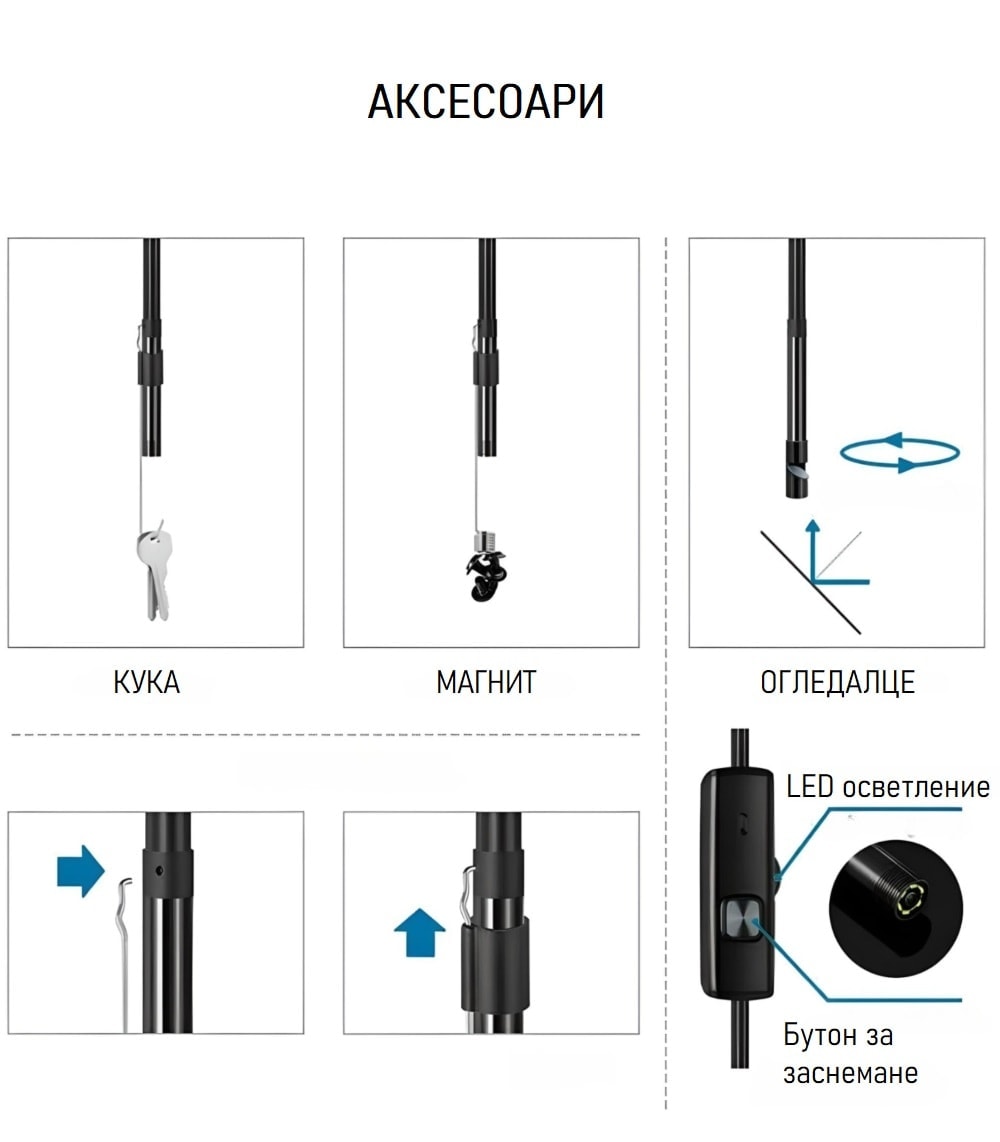 - Кука – аксесоар идеален за инспекции, където трябва да издърпате или манипулирате предмети в труднодостъпни места.