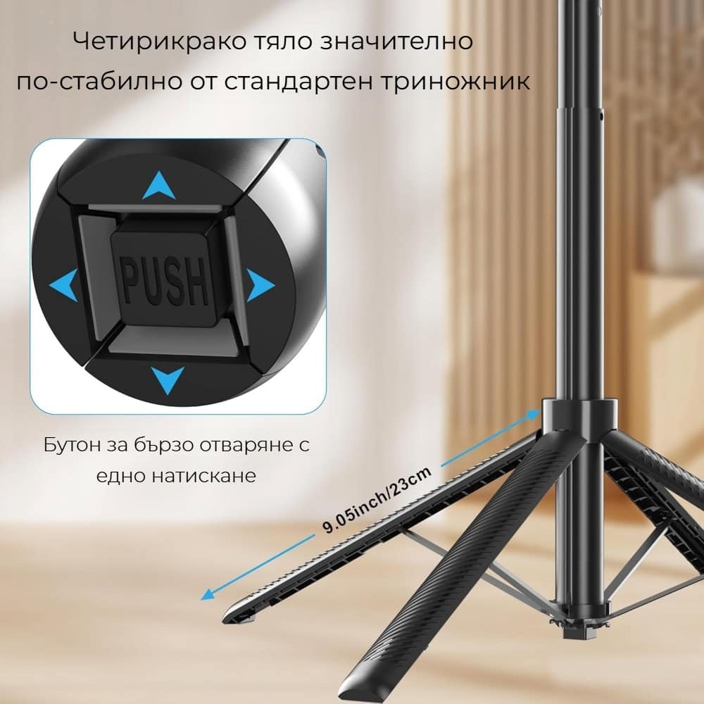 Селфи стик – куадпод LAIGI C12 съчетава модерна технология и стабилност в един продукт. С интелигентно AI проследяване, височина до 1.8 м и четирикрака стабилна конструкция, той следи всяко ваше движение и гарантира, че винаги сте в центъра на кадъра.