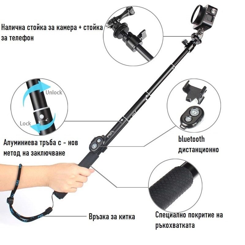 ✓  Нова технология за заключване, която позволява селфи стика да бъде в идялана права форма, дори и на максимално разтегнато положение.