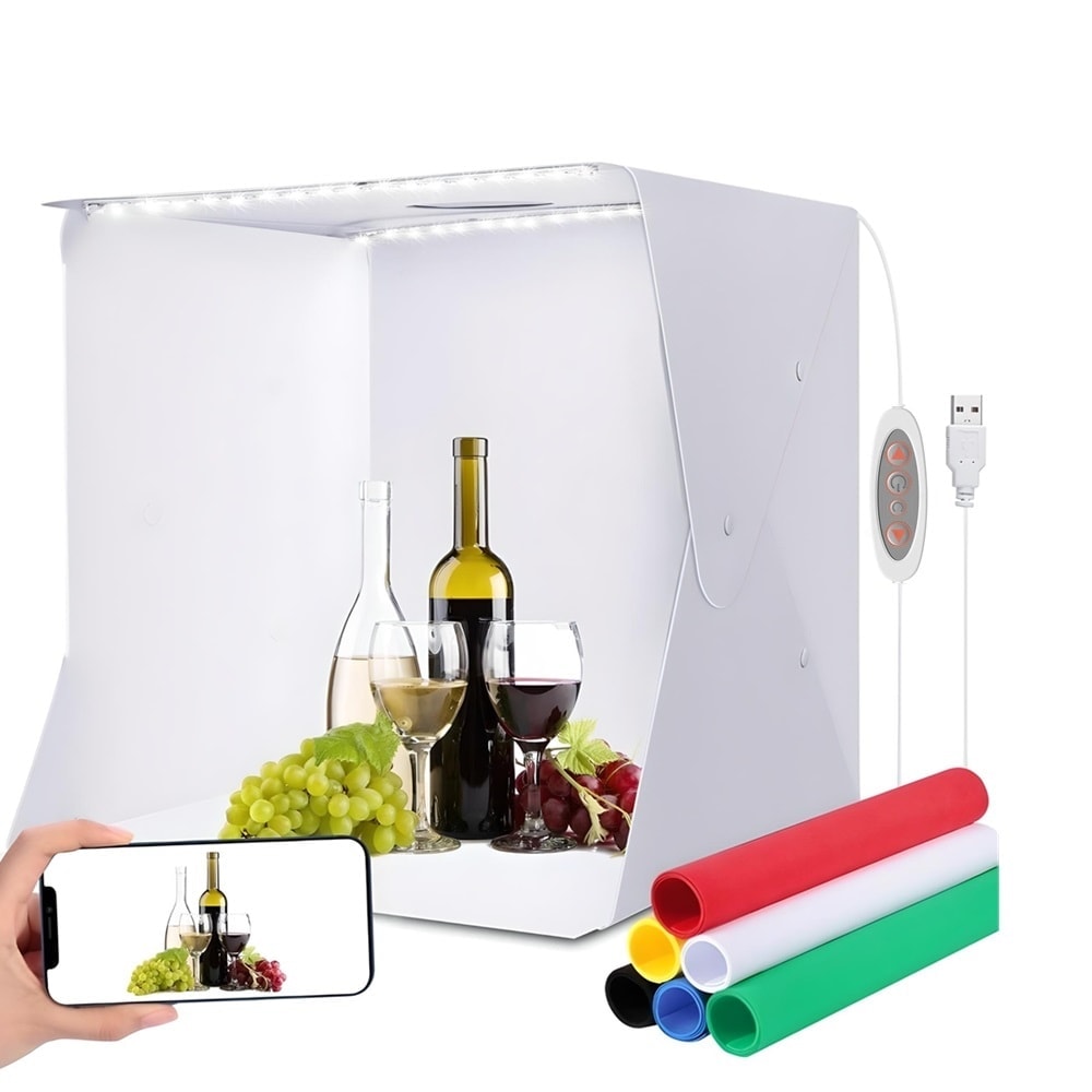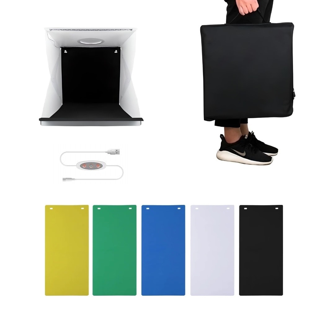 Професионалната Фотографска Кутия 40 см за предметна/продуктова фотография, включва в себе си 5 PVC основни фона: