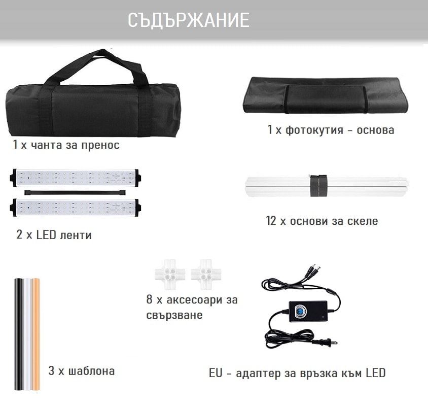 С 5600K | 15000 LUX, LED осветлението ви предосатвя възможност да зададете небходимата светлина за всеки продукт и кадър.