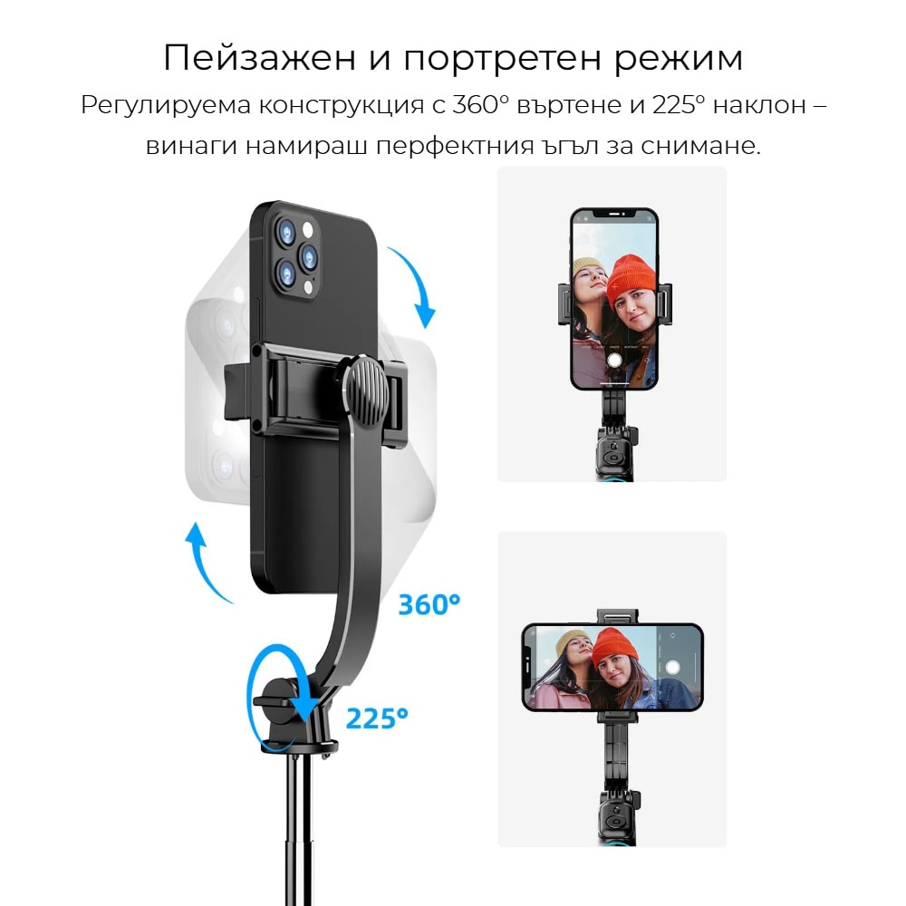 HSU C01 разполага с напълно въртяща се на 360° глава, която ти позволява да променяш ъгъла на снимане само с едно движение. Независимо дали искаш портретен кадър за социалните мрежи или пейзажна снимка за пътуванията си, можеш лесно да превключваш между режимите и винаги да намираш идеалната перспектива.
