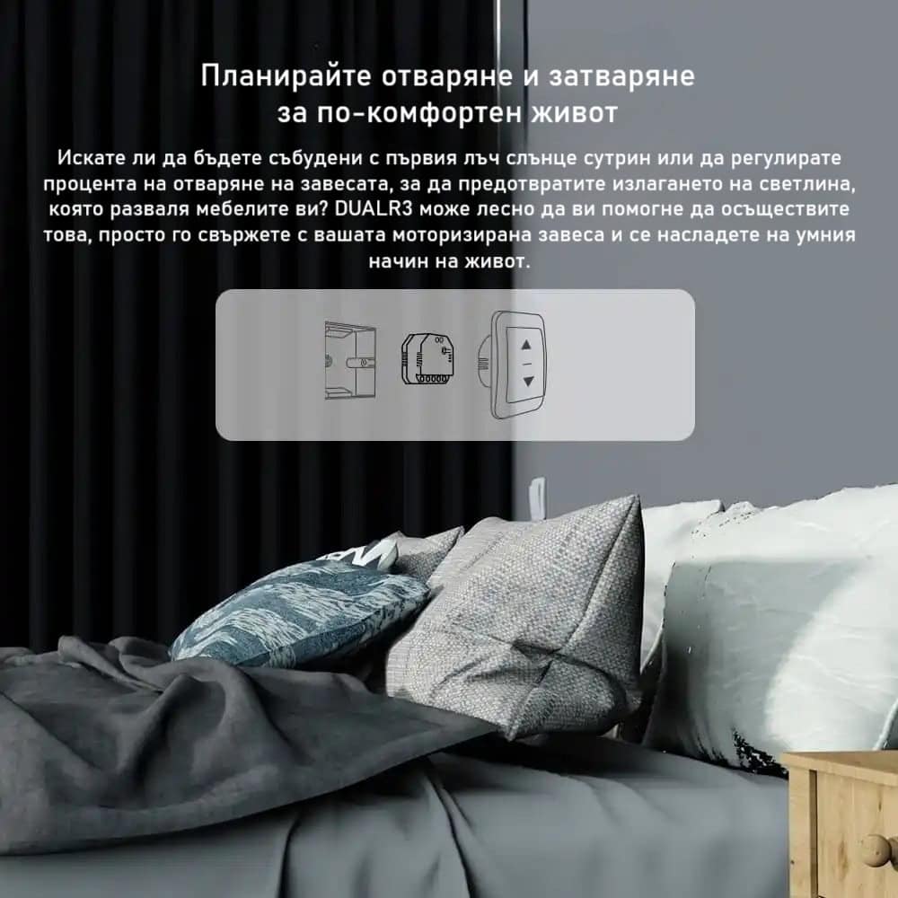 Може да се комбинира с други SONOFF устройства и да създавате автоматизирани сценарии, например завесите да се затварят при залез или осветлението да се включва при засичане на движение.