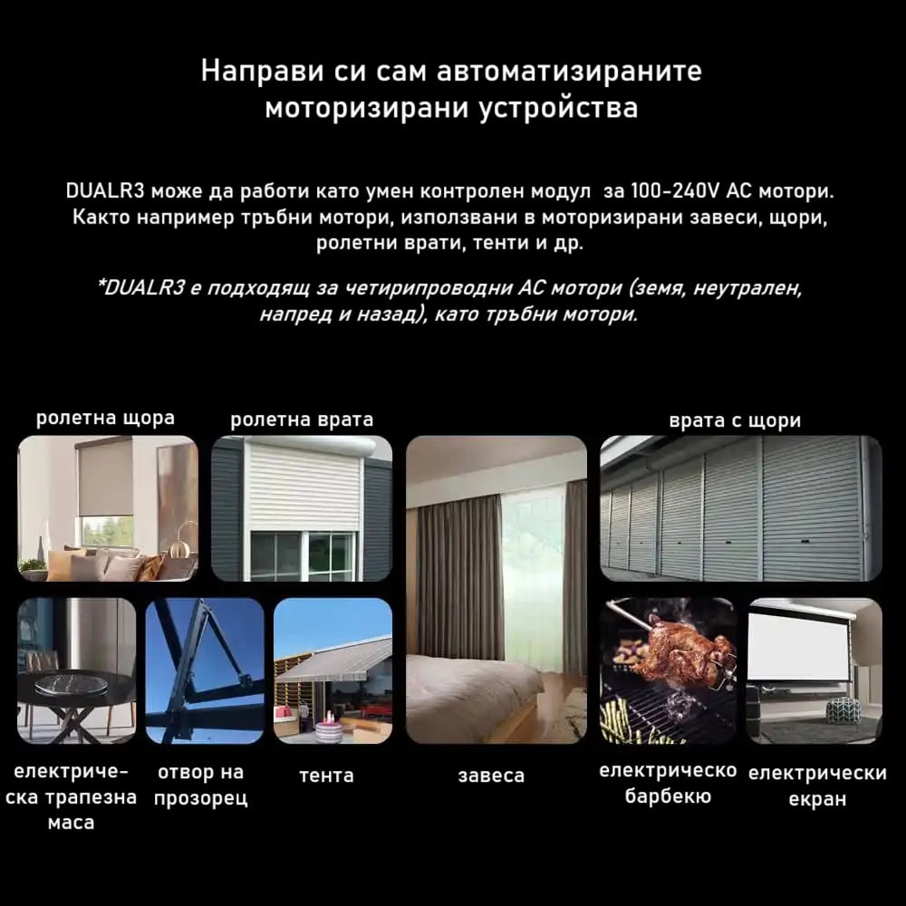 Оптимизира работата на ролетни щори, завеси, гаражни врати и тенти, като ви позволява да зададете прецизни позиции и да контролирате движението им с процентна настройка.