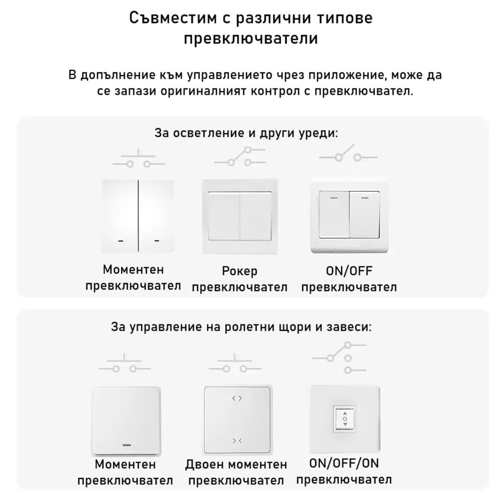Позволява ви да управлявате две устройства независимо едно от друго, като можете да използвате отделни физически ключове или мобилното приложение за контрол.