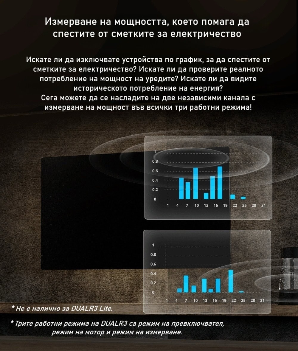 SONOFF DUALR3 разполага с вградена функция за енергиен мониторинг, която ви позволява да следите консумацията на свързаните устройства в реално време. Той измерва напрежение (V), ток (A) и мощност (W), както и записва исторически данни за потреблението. Това ви дава възможност да анализирате разходите за електроенергия и да оптимизирате използването на уредите си, като намалите ненужното потребление.