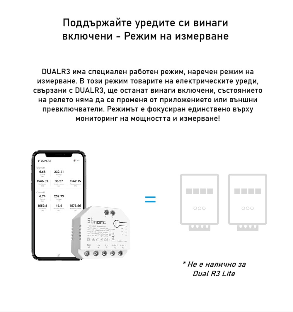 Представяме ви SONOFF DUALR3 – Двуканален смарт превключвател с измерване на мощността – е иновативен смарт превключвател, който ви позволява да управлявате електрическите устройства в дома си и да следите тяхната енергийна консумация. С интегрирани функции за дистанционно управление и измерване на мощността, този модул е идеален за всяко домакинство, което търси по-умно и ефективно управление на енергията.