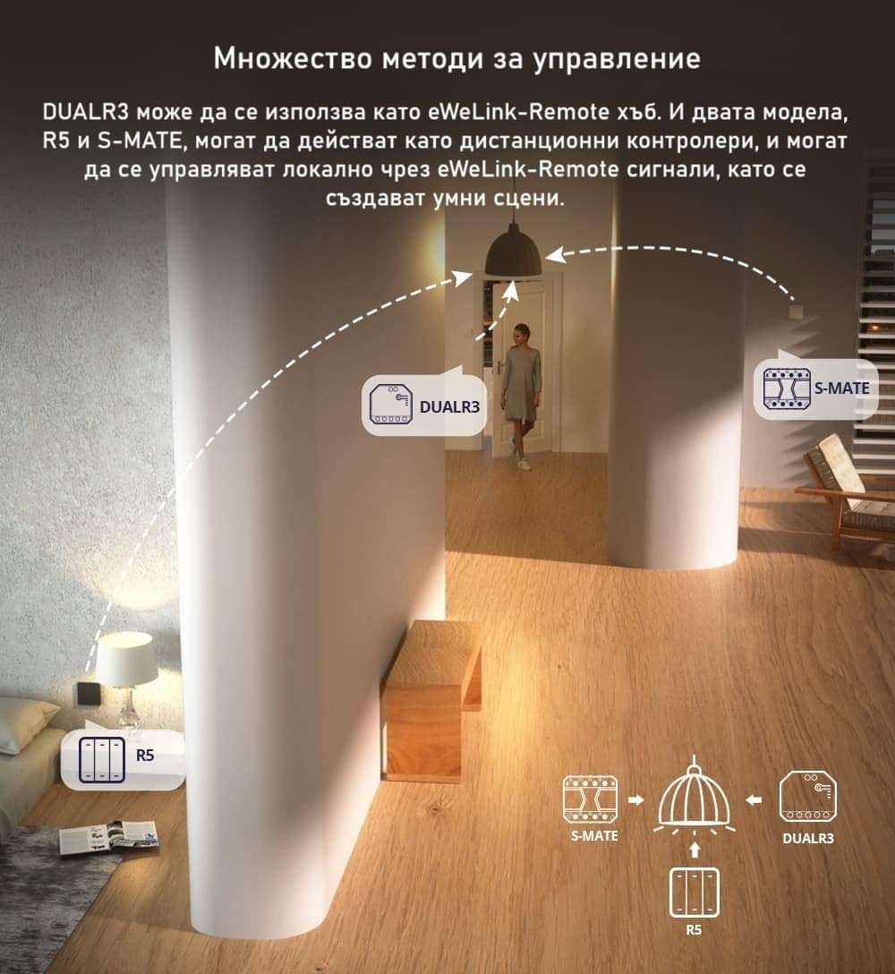 DUALR3 поддържа eWeLink-Remote, което означава, че може да бъде използван като хъб за R5 сцена контролер и S-MATE / S-MATE 2 превключвател. Това ви позволява локален контрол на устройството чрез eWeLink-Remote сигнали, без да разчитате на Wi-Fi или интернет връзка.