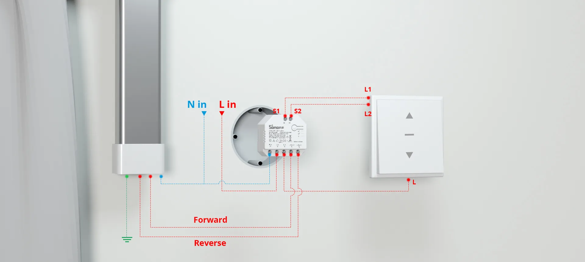 За да активирате управлението с двоен релe, S1 и S2 трябва да бъдат свързани към бутонен превключвател в режим на импулс или рокер превключвател в edge режим: