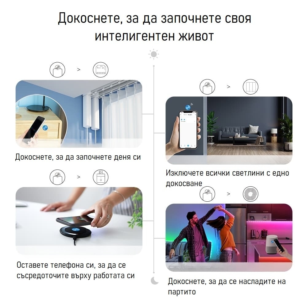 ✓ Лесен за използване – просто допрете NFC етикета с вашия телефон, за да включите умните устройства.