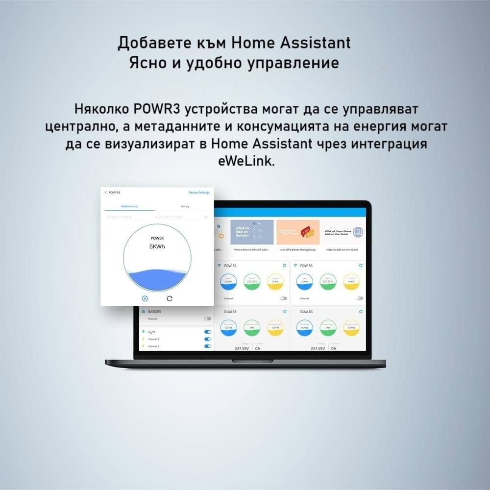 POWR3 може да се интегрира с Home Assistant чрез eWeLink Add-on, което позволява централизирано управление на няколко устройства едновременно. Освен това метаданните и енергийната консумация могат да бъдат наблюдавани в платформата.