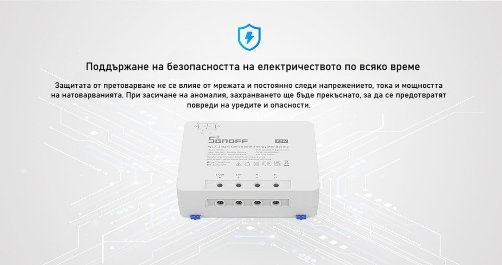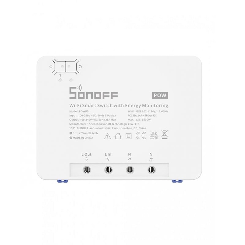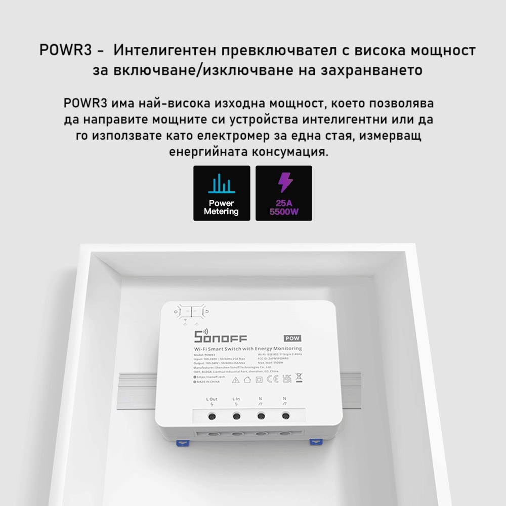 SONOFF POWR3 е интелигентен превключвател с висока мощност, който ви позволява да управлявате и следите енергопотреблението на вашите устройства. С максимална мощност от 25A/5500W, той е подходящ за управление на мощни уреди и може да се използва като интелигентен електромер за цяла стая.