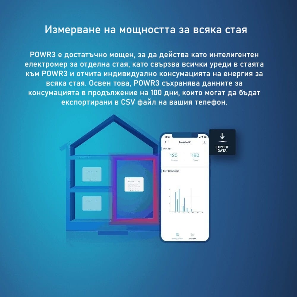 SONOFF POWR3 съхранява до 100 дни информация за консумацията на електроенергия, която може да бъде експортирана в CSV формат за по-детайлен анализ. Това ви помага да идентифицирате скритите разходи и да управлявате ефективно енергопотреблението си.
