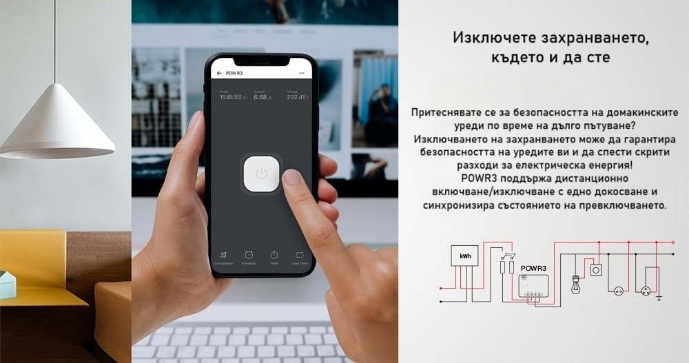 Управлявайте уредите си от всяка точка на света чрез мобилното приложение eWeLink. Можете да включвате/изключвате уреди с едно докосване, да задавате графици за работа, както и да следите текущия статус на превключването.