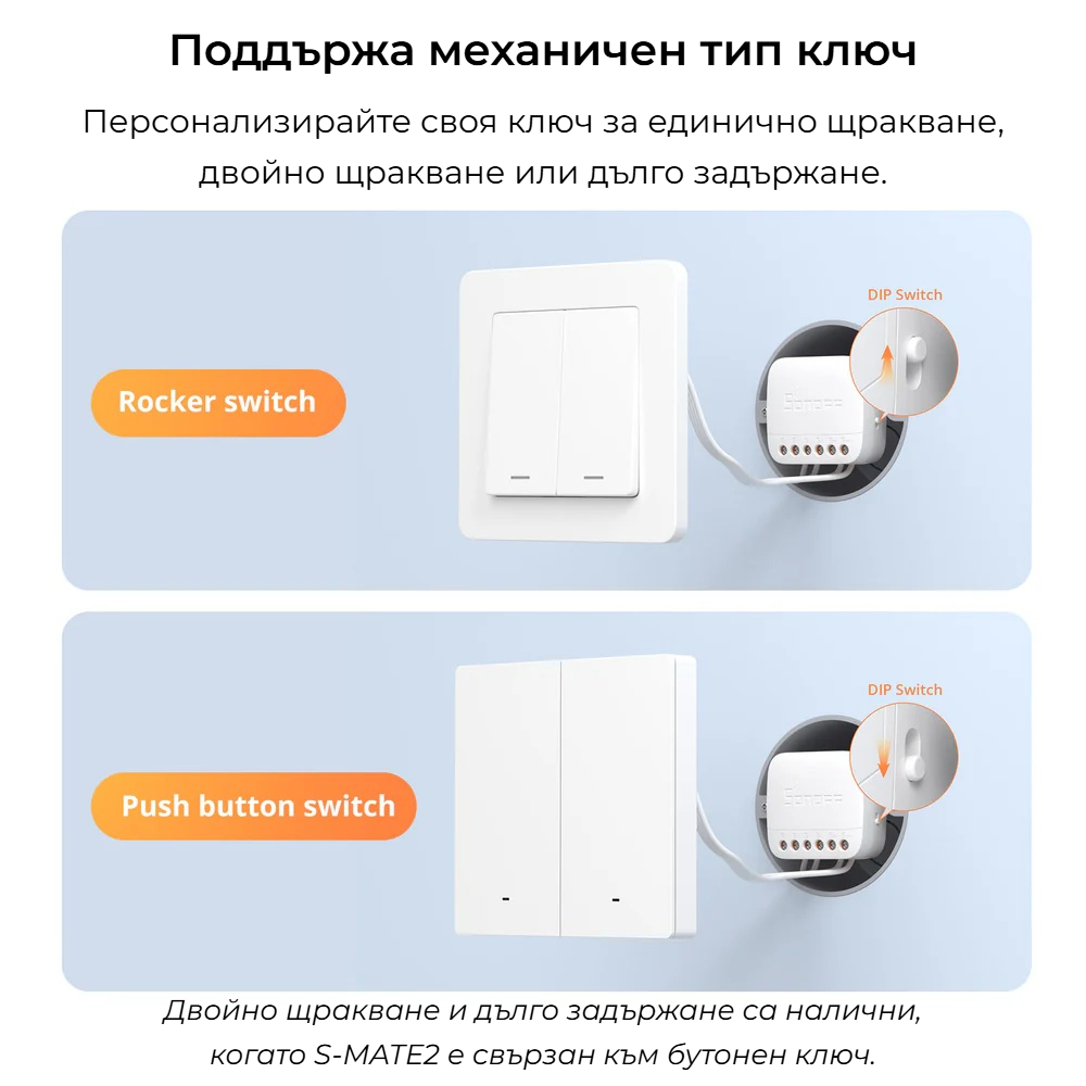 SONOFF S-MATE 2 е проектиран да работи с почти всеки тип стенен ключ, включително pulse, rocker и други. Това ви дава свобода да използвате модула с вече съществуващите ключове в дома си, без нужда от смяна на интериора или окабеляването. Широката съвместимост прави S-MATE 2 универсално решение за модернизация на дома и интеграция в смарт системи.