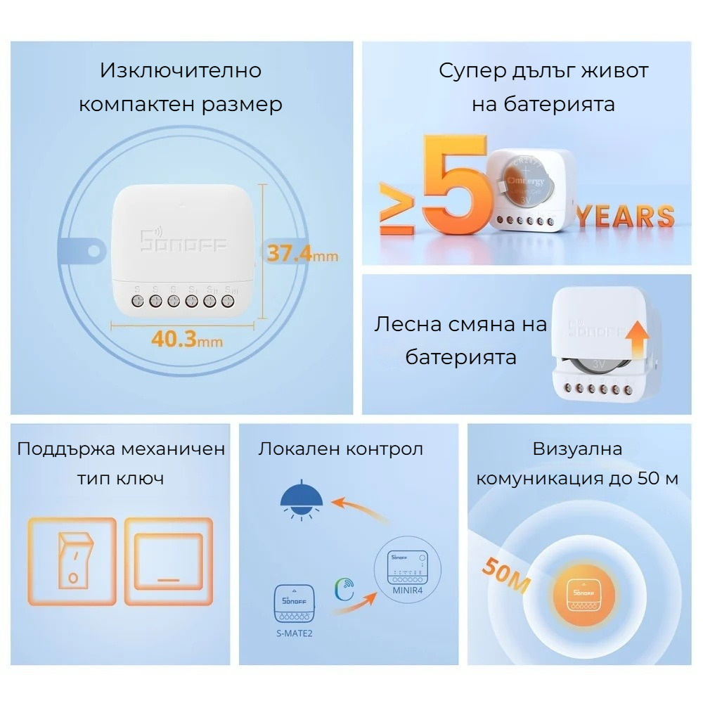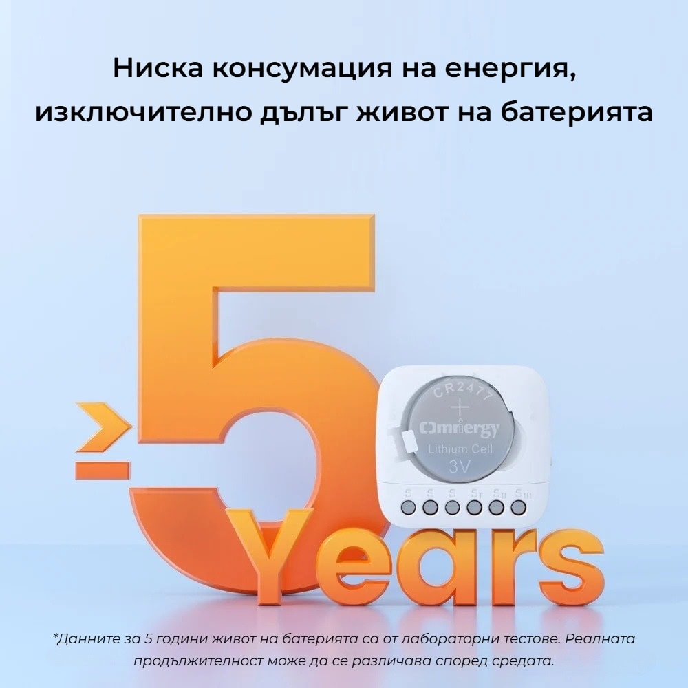 SONOFF S-MATE 2 разполага с батерия с изключително дълъг живот – до 5 години, което означава минимална поддръжка и рядка необходимост от смяна. Това ви позволява да се наслаждавате на смарт функциите на модула без грижи за батерията, като същевременно поддържате надеждно управление на светлини и устройства в дома си.
