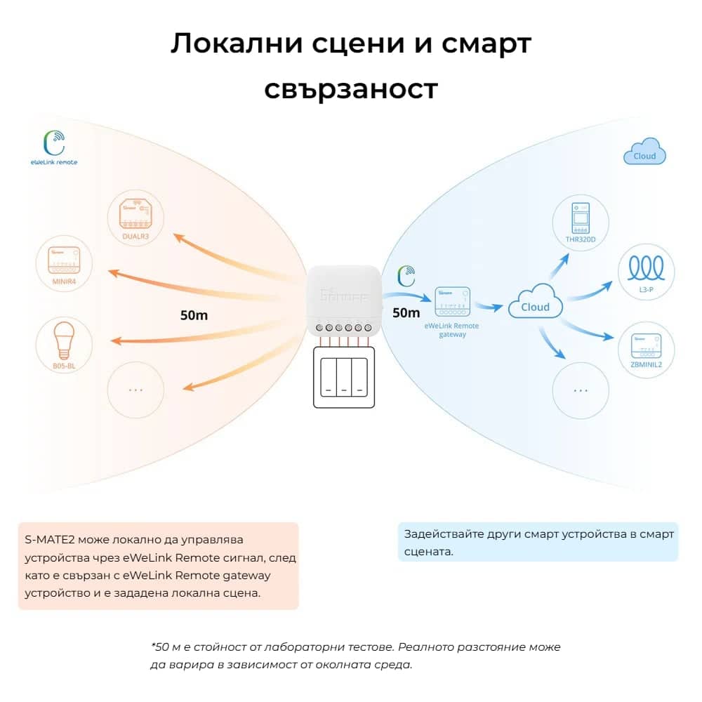 S-MATE 2 позволява локално управление на осветлението и устройствата без необходимост от Wi-Fi връзка. Това означава, че можете да контролирате дома си дори при прекъснат интернет, като използвате своя механичен ключ или свързан eWeLink Remote. Локалното управление осигурява надеждност, бързина на реакцията и пълна независимост от външни мрежи.