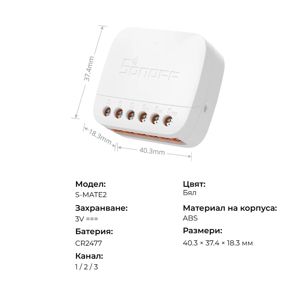 SONOFF S-MATE 2 е компактен смарт модул, който превръща обикновените стенни ключове в интелигентни контролери за осветление и други устройства. Работи с механични ключове и eWeLink Remote, позволява локално и дистанционно управление, без необходимост от ново окабеляване, и поддържа сцени за автоматизация на дома.