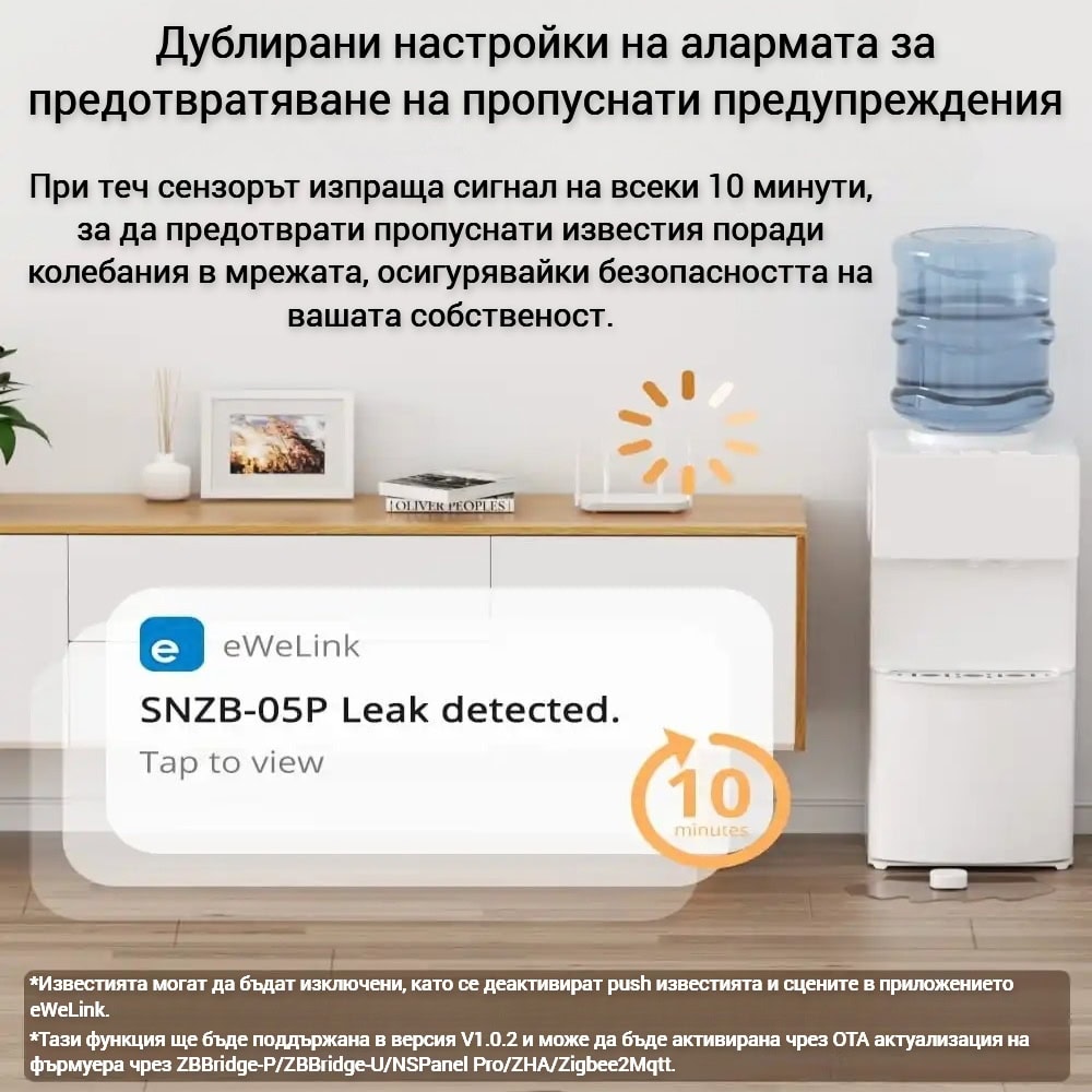 При откритие на теч сензорът изпраща мигновени push известия към вашето мобилно устройство, което ви уведомява веднага за проблема. Сензорът може също така да активира звукова аларма на свързаните хъбове, дори ако WiFi мрежата е неактивна, осигурявайки надеждност в критични моменти. Допълнително, сензорът предлага възможност за имейл и SMS известия (с абонамент за eWeLink Advanced план и настройка на IFTTT).