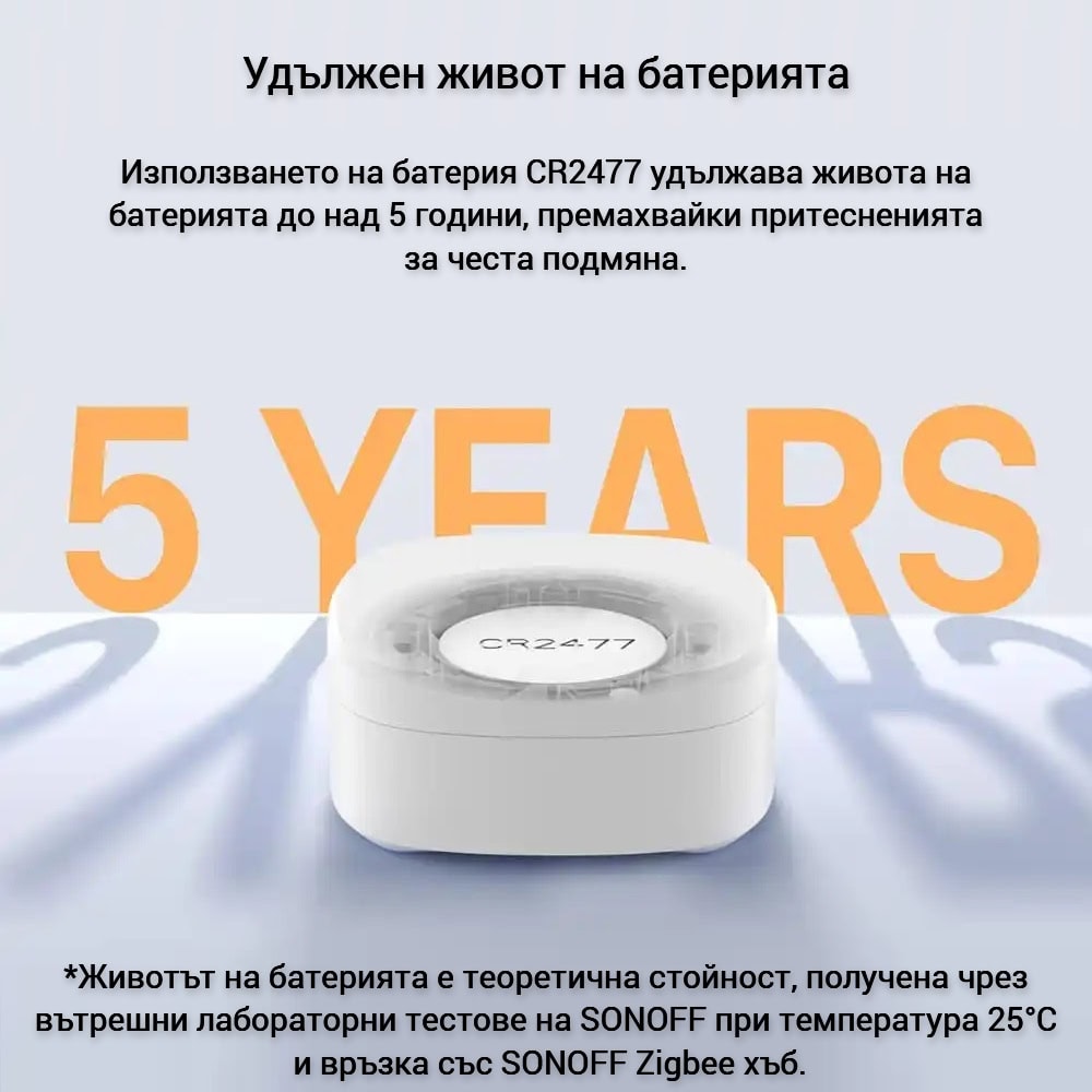 Сензорът работи с батерия CR2477, която има продължителен живот до 5 години, в зависимост от честотата на сработване (до 50 пъти на ден). Това значително намалява нуждата от чести подмени на батериите и ви дава увереност, че системата е надеждна в дългосрочен план.
