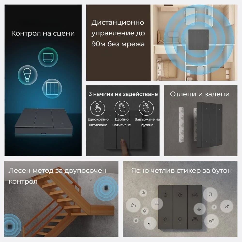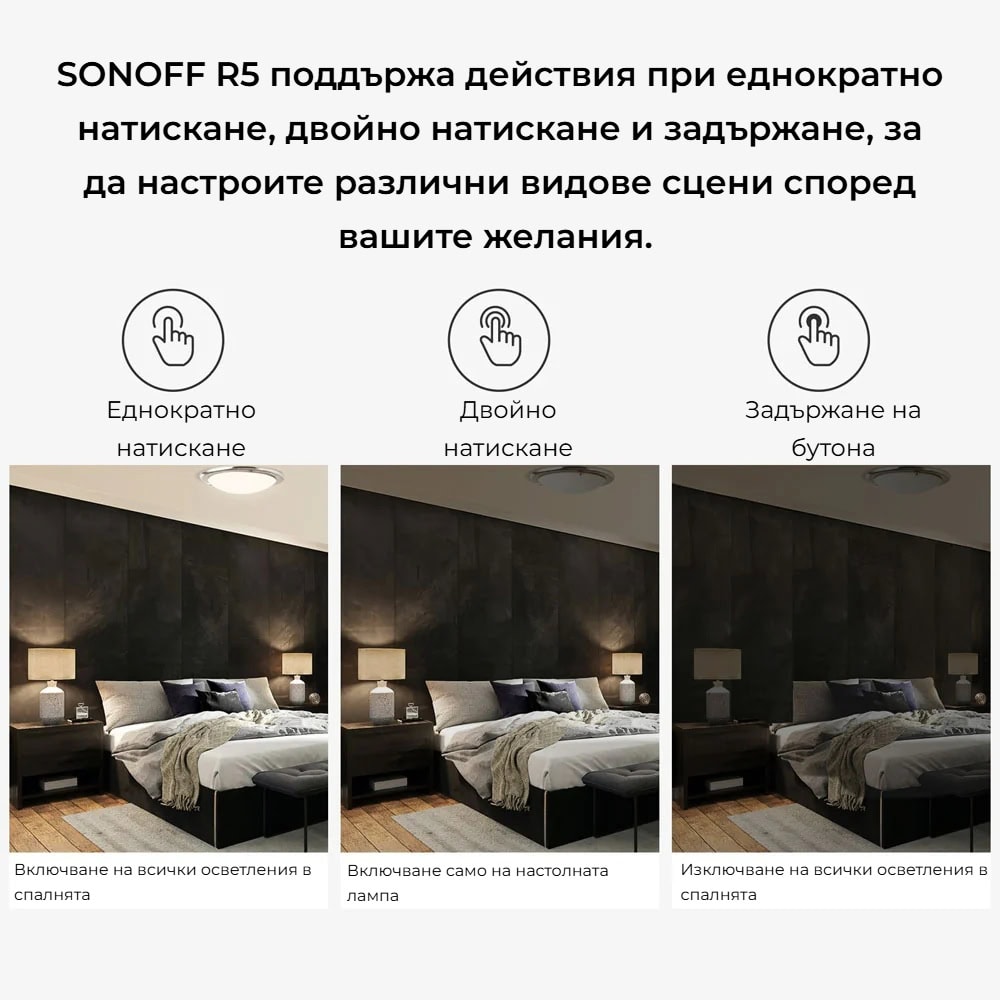 С SONOFF SwitchMan R5получавате свобода да настроите до 18 персонализирани действия. Благодарение на трите начина на задействане – еднократно натискане, двойно натискане и задържане, всеки от 6-те бутона може да изпълнява по три различни функции. Това ви позволява да управлявате индивидуални устройства, да активирате сцени или да контролирате цели стаи само с едно движение.