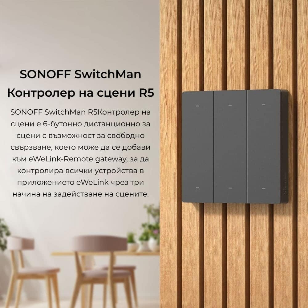 SONOFF SwitchMan R5 е елегантен и практичен 6-бутонен контролер на сцени, който ви позволява да управлявате смарт устройства и осветление у дома само с едно докосване. Монтира се лесно – без нужда от окабеляване – и може да се използва както като стенен ключ, така и като дистанционно управление. Благодарение на трите начина на задействане (еднократно натискане, двойно натискане и задържане) R5 ви дава до 18 различни действия, за да персонализирате контрола според вашите нужди. С обхват до 90 метра и дълъг живот на батерията, това е перфектното решение за модерен и удобен смарт дом.