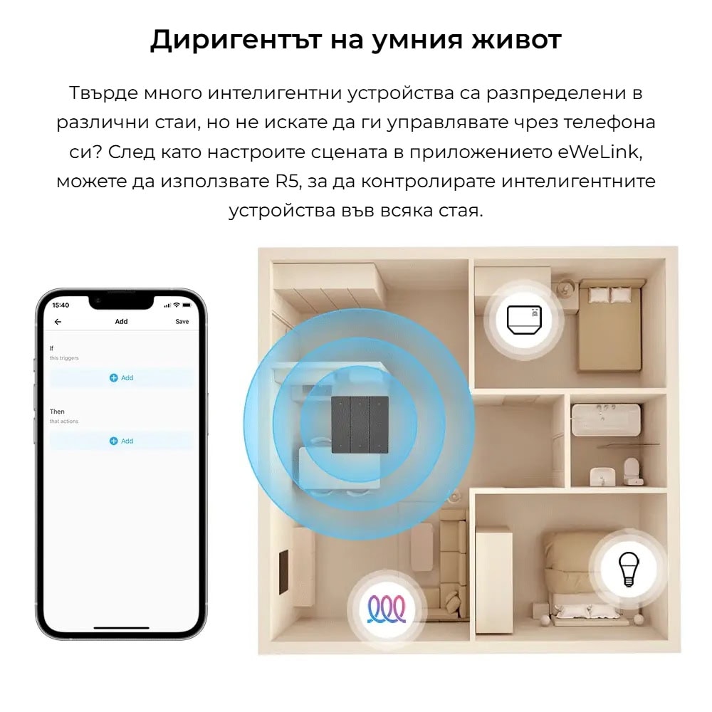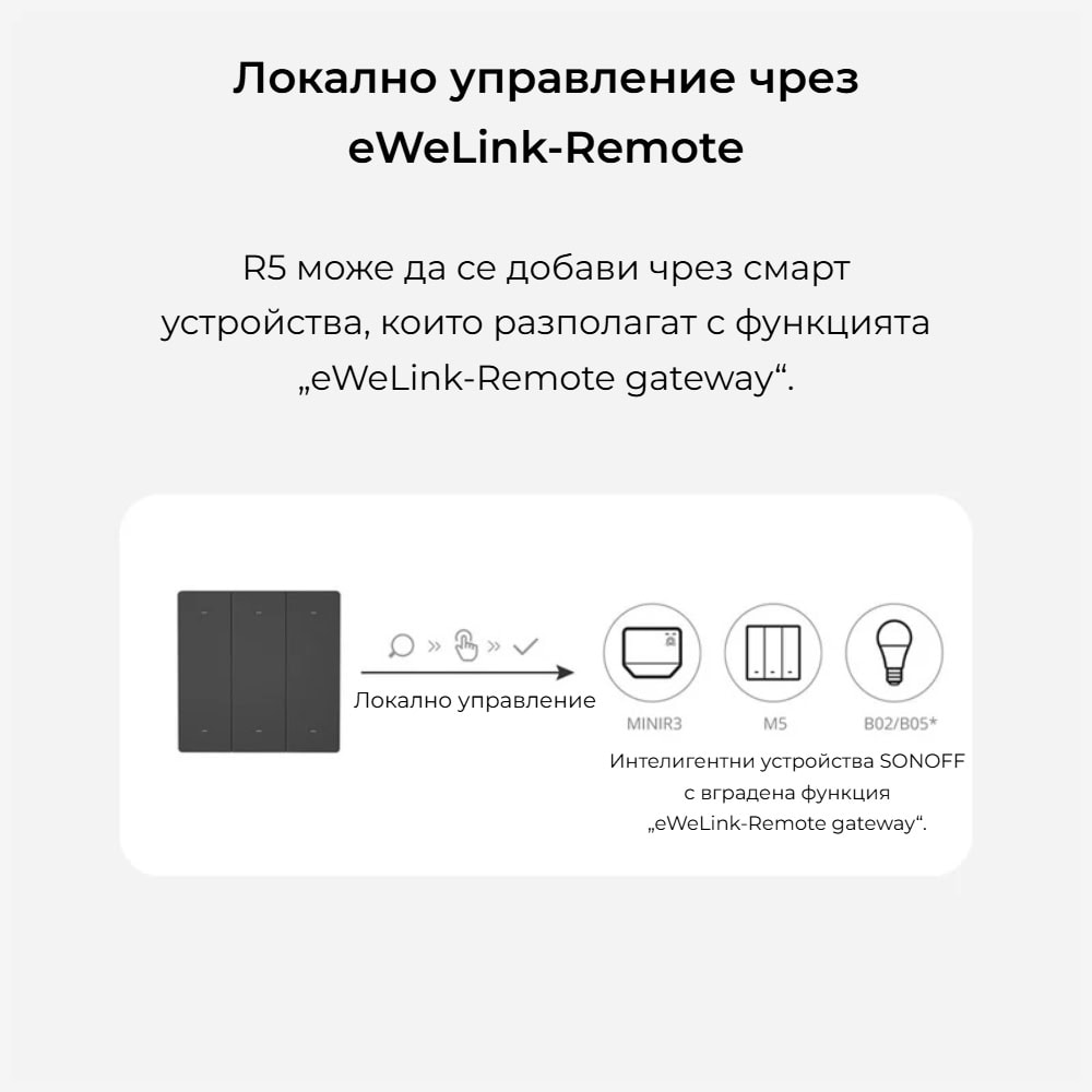 SONOFF SwitchMan R5 работи с функцията eWeLink Remote, позволявайки ви да управлявате смарт устройства и сцени локално и без интернет. Чрез eWeLink-Remote gateway, R5 може да контролира устройства на разстояние до 90 метра, като осигурява стабилна и надеждна връзка за удобно управление на вашия умен дом.