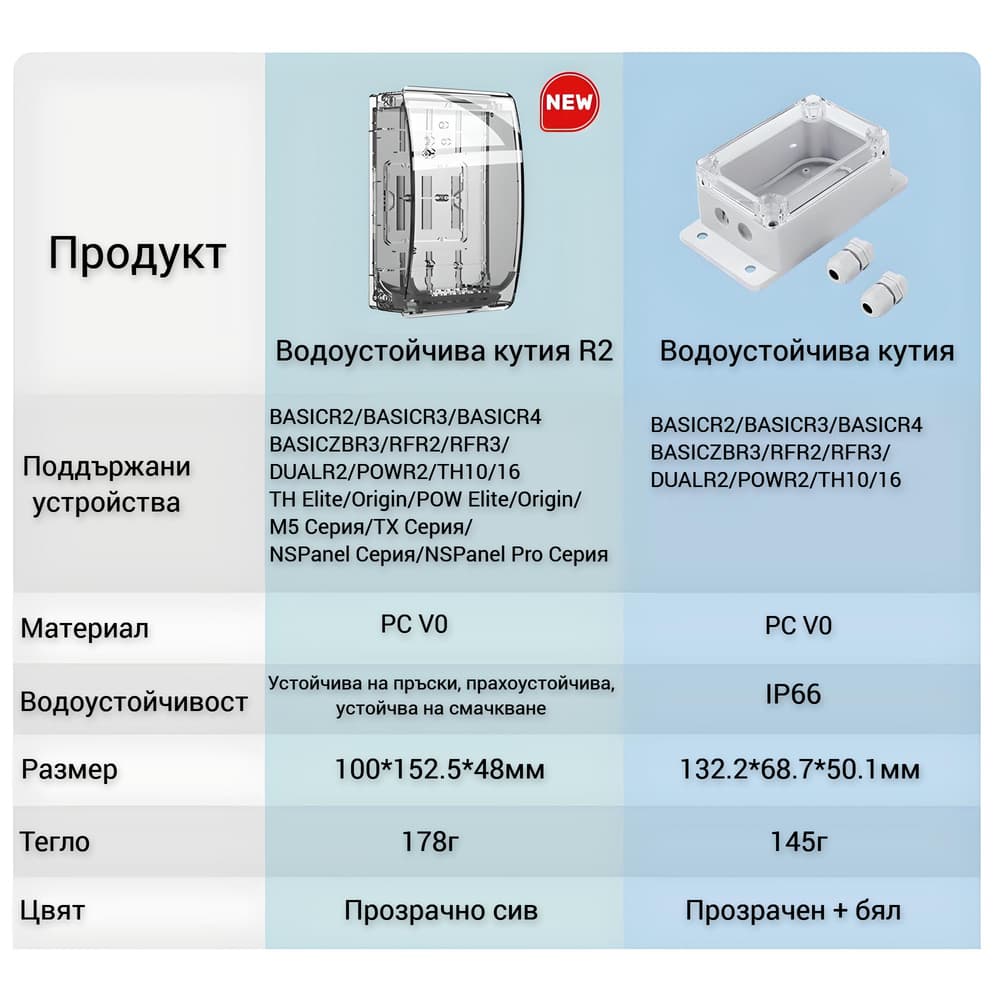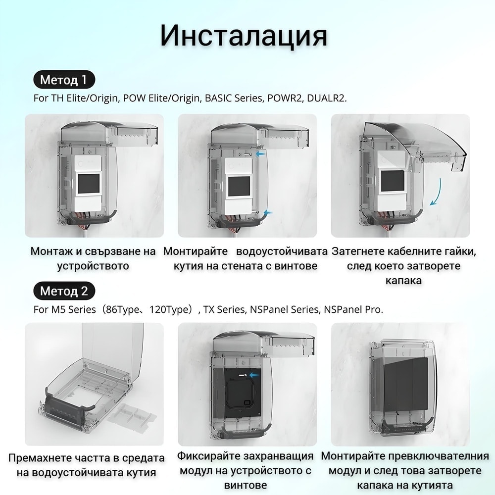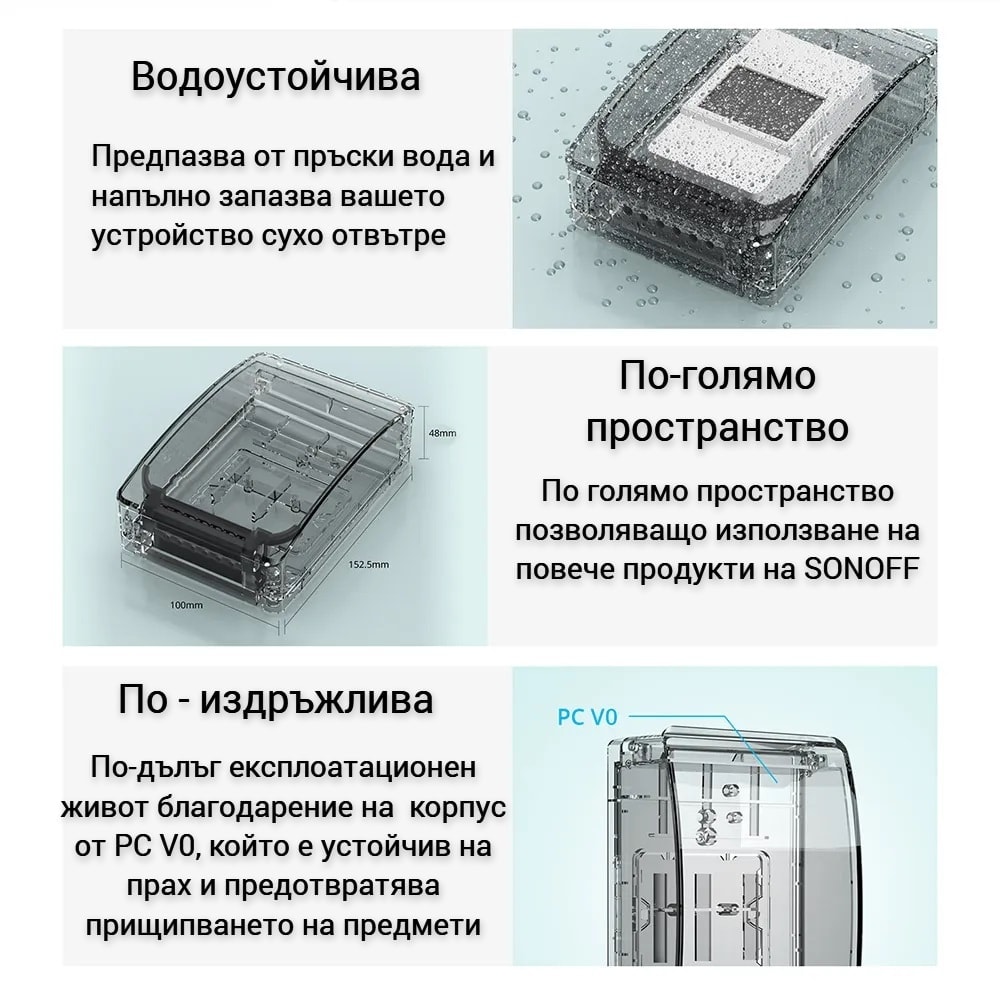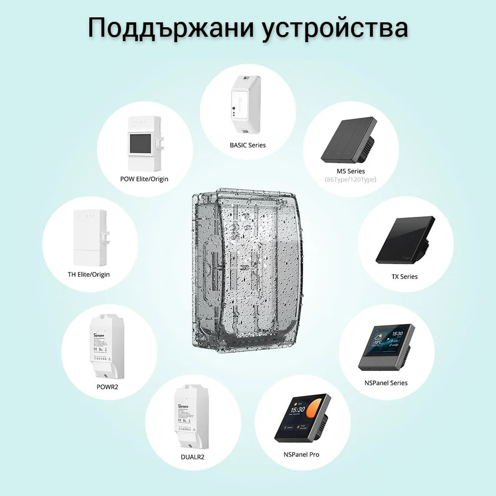 Съвместима с голям брой устройства на SONOFF, кутията предоставя гъвкавост и възможност за защита на различни видове устройства.