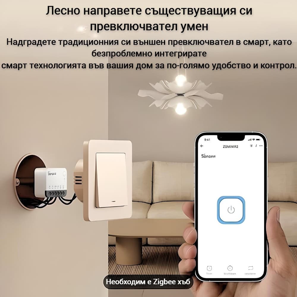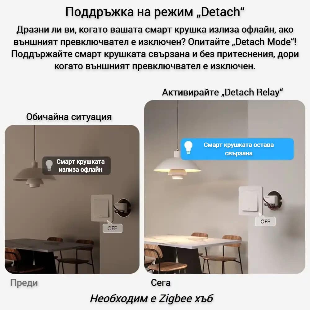 Една от уникалните функции наZBMINIR2 е Detach Relay Mode, който позволява на смарт осветлението да остане свързано дори когато външният ключ е изключен. Това означава, че вашите смарт крушки няма да излязат от мрежата при физическо изключване на захранването чрез външния ключ, което осигурява удобство и стабилност.