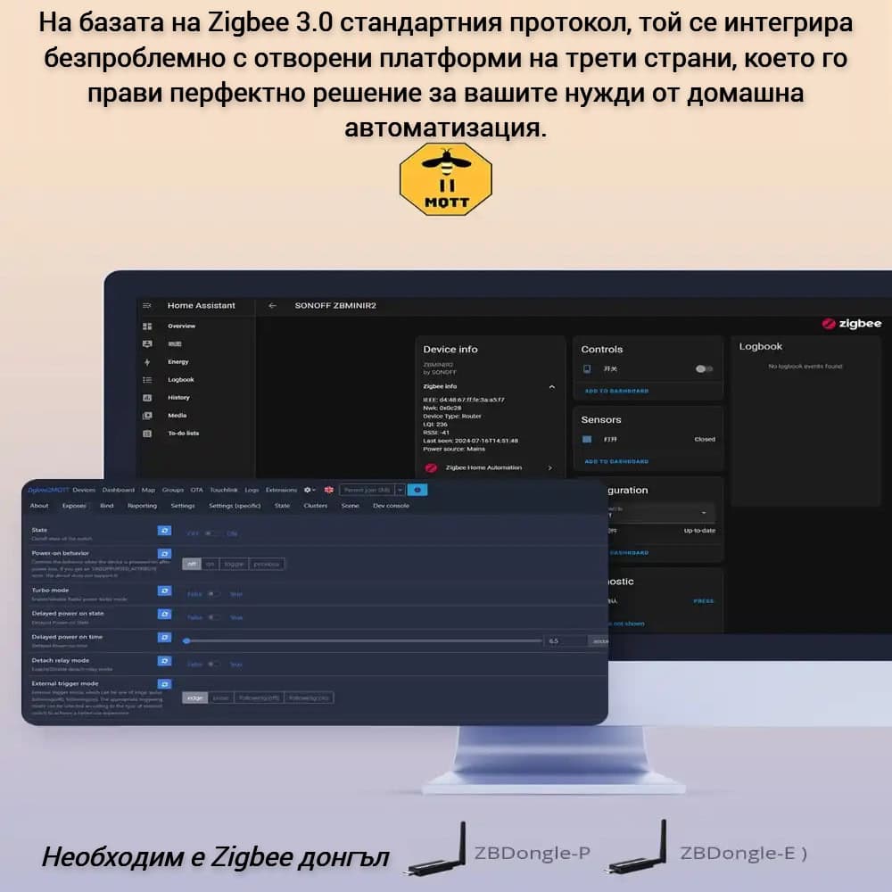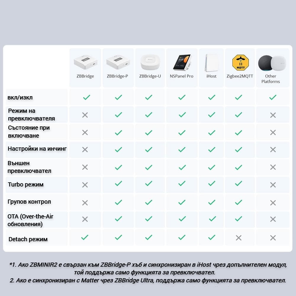 Съвместим с различни ZigBee хъбове, като SONOFF NSPanel Pro, iHost, ZB Bridge (ZBBridge-P/ZBBridge-U), SmartThings hub v3, Echo Plus 2-ро поколение и други. Това осигурява широка съвместимост с различни платформи за управление на вашия умния дом.